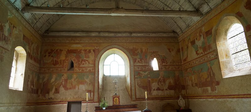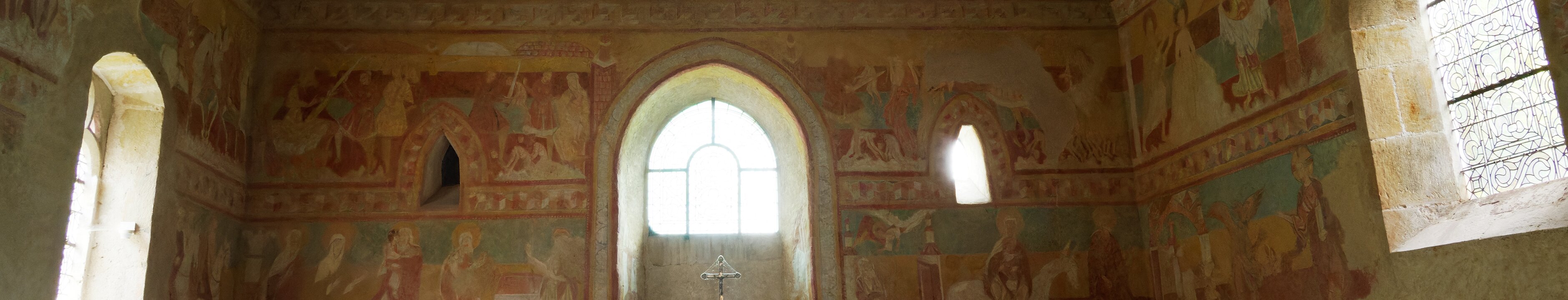 south wall top left: baptism of Jesus; top right: marriage of Cana;bottom left: Satan tempts Jesus; bottom right: angels wait on Jesus