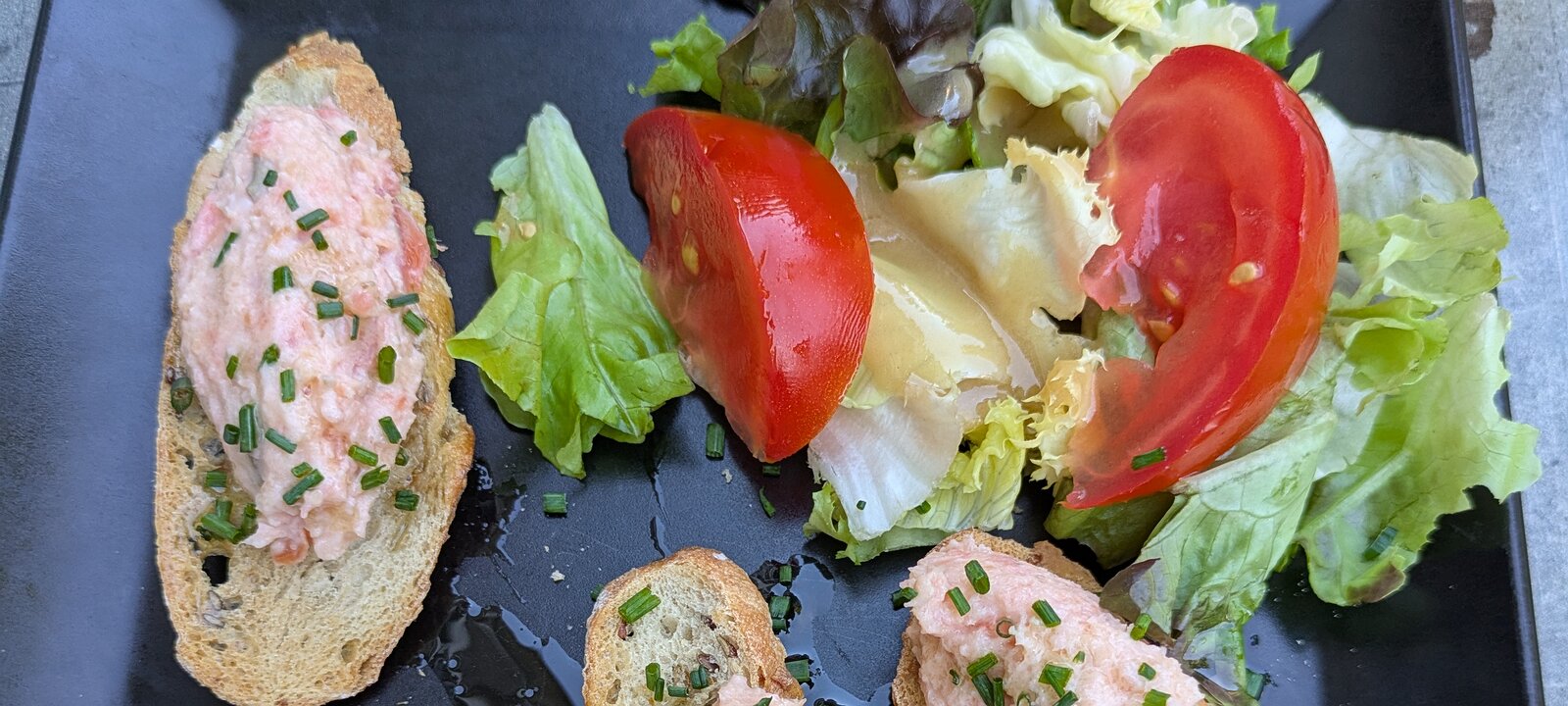 Rillette de truite fraiche et fumée, chèvre de Chavignol et huile de noix, toasts