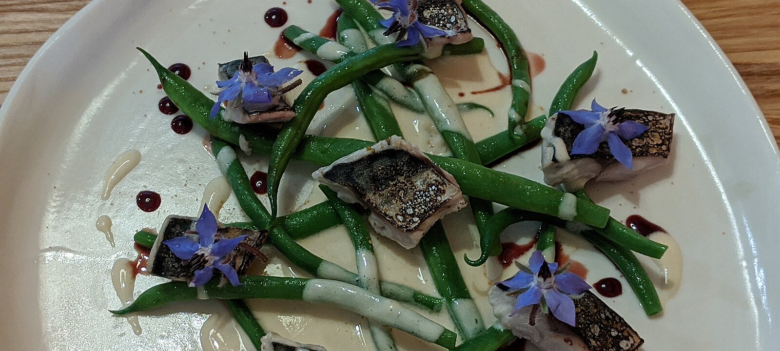 second course: Mediterranean mackerel, green beans, crème aux fleurs d'acacia, huile de cerise