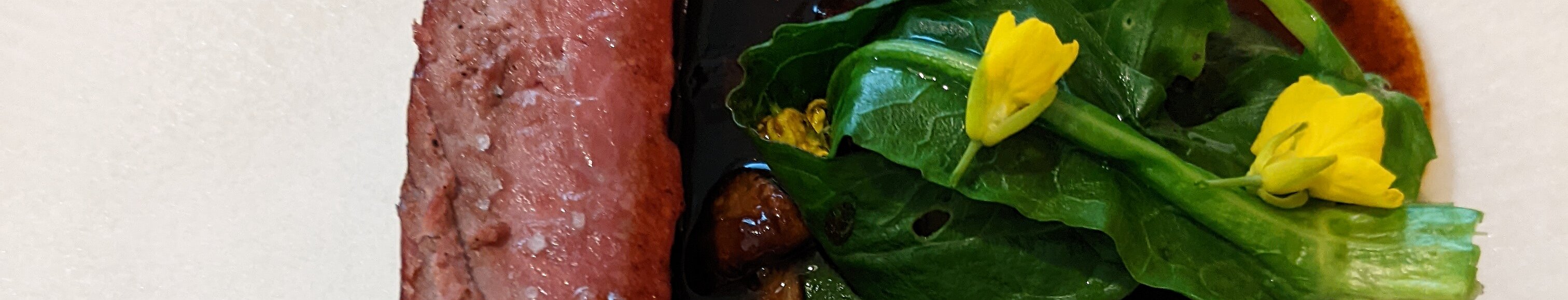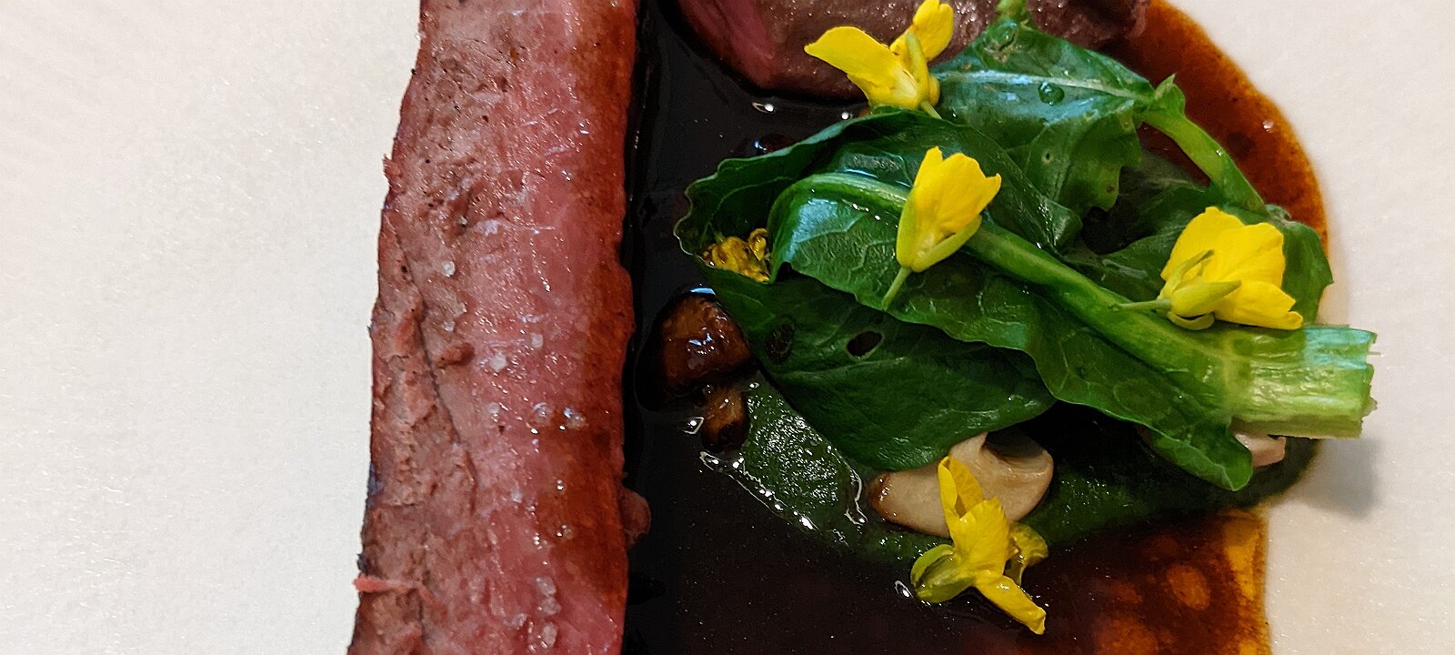 sixth course: Roasted lamb with St George's mushrooms, colza leaf, spinach
