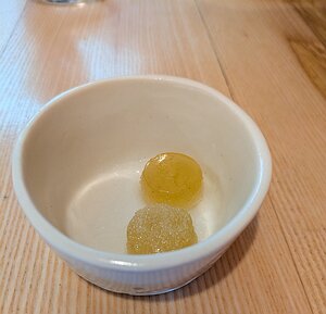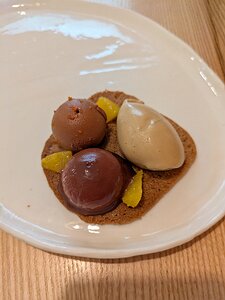 orange biscuit, chocolate ball coated with orange and an orange ball coated with chocolate and a caramel ice
