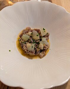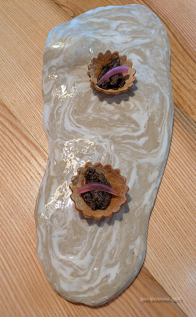 amuse bouche: tartelette de champignon duxelles et oignon rouge marinés (pickled)