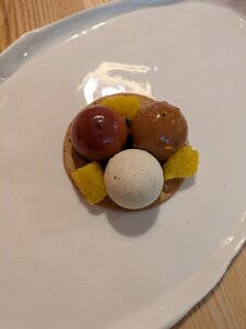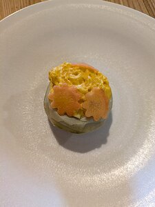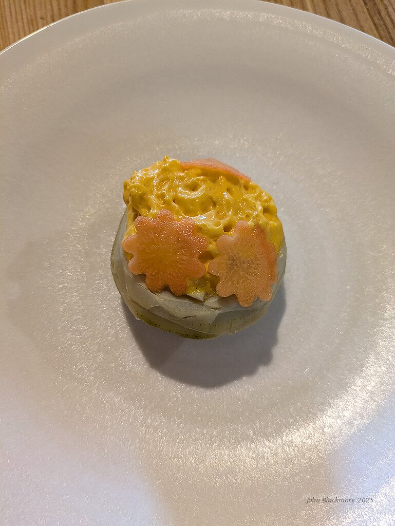 first course: warm artichoke heart with carrot cream and pickled carrot