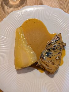 main course: glazed parsnip and deboned chicken thigh cooked over fire with cider sauce