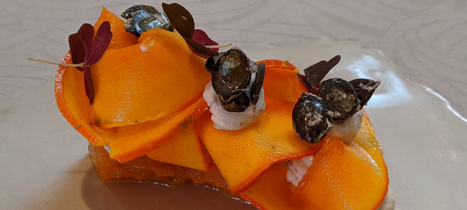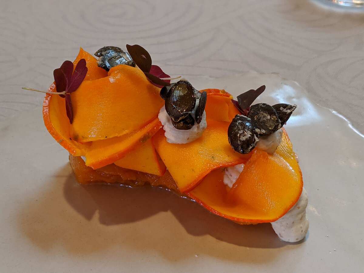 Amuse bouche 1: potiron cones with potiron cream, pumpkin seeds and smoked paprika