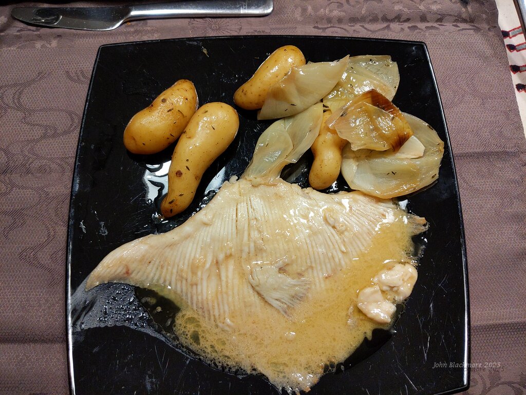 main: Raie de Méditerranée au beurre noisette, grenailles et oignons rôties