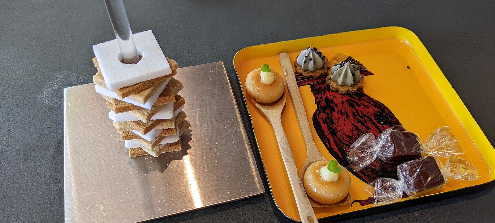 baby lemon rum babas, sesame biscuits with cream, chocolate bonbon (and sugar squares)