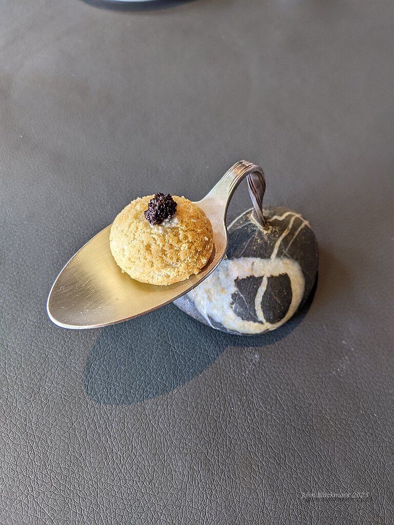 L'omble chevalier servi froid, jus lacté au genièvre, aubergine confite et condirnent au piment de Bresse, croquant sarrasin