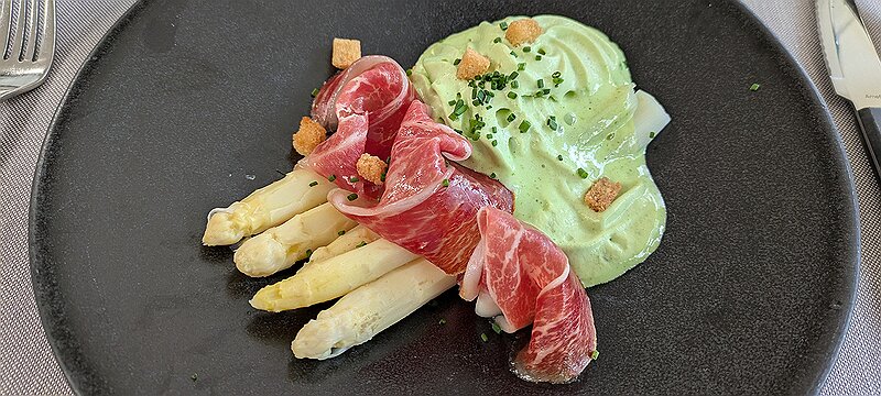 Asperges Fondantes, Jambon Ibérique, Mousseline à l'Ail des Ours