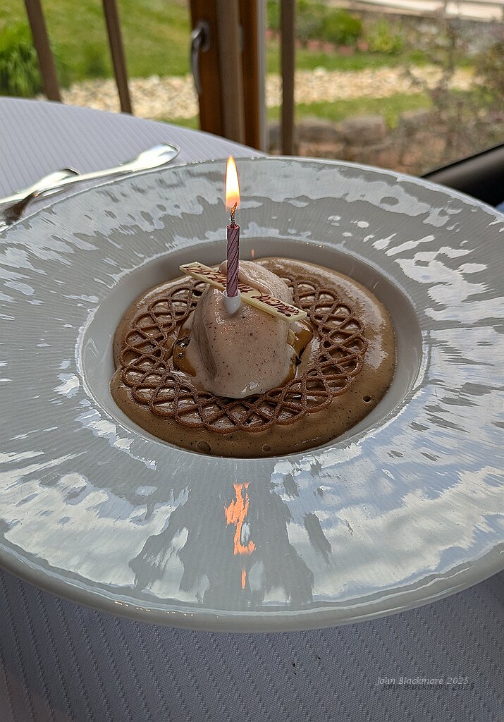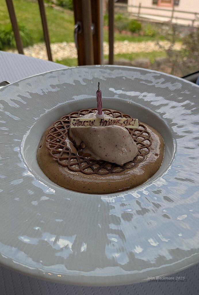 Birthday dessert - Mousseux au café, moelleux et éclats de noisettes, creme glacée a l’'anis étoilée et lait fermenté