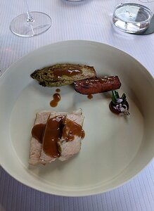 Oignons de Sélestat confits, foie gras de canard cuit au sel, tuile de pain et bouillon de peaux d’oignons rouges