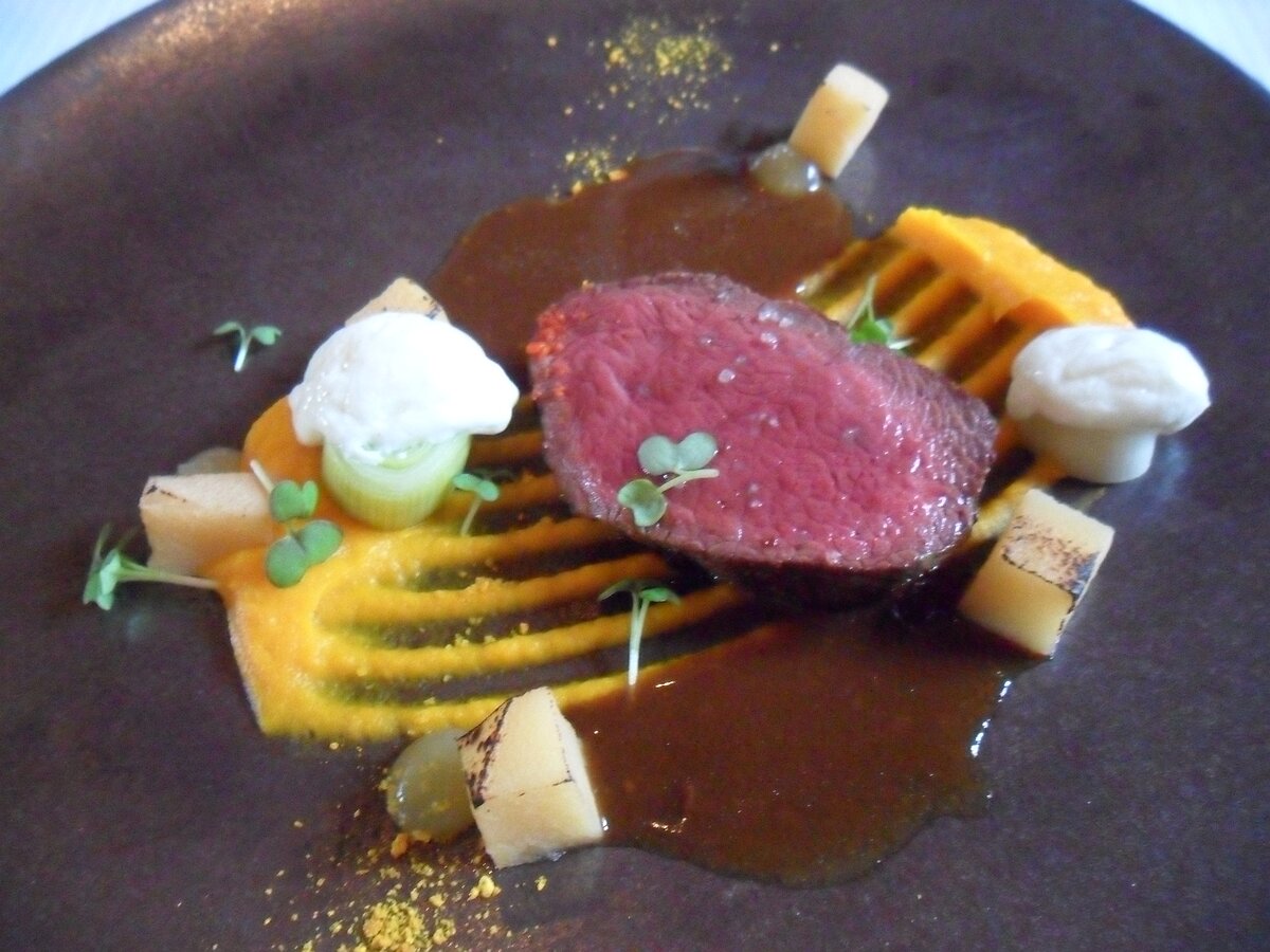 main: Selle de biche, gel et poussiere d'agrumes, potimarron, blanc de poireau et faisselle