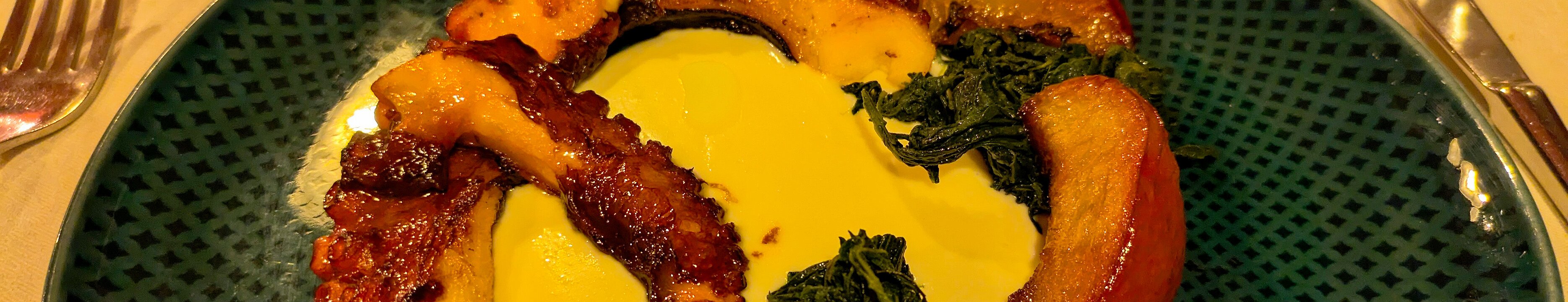 (Roasted octopus, Castelmagno fondue, nettle and peach) 24€