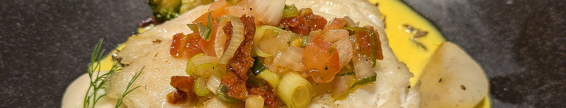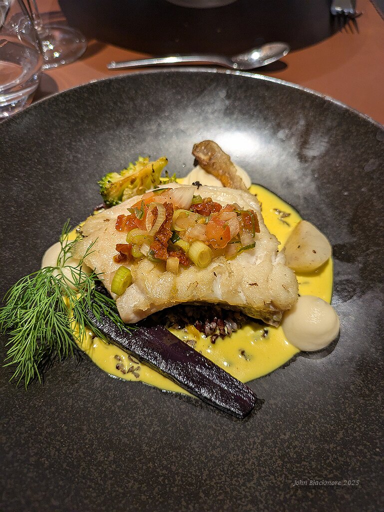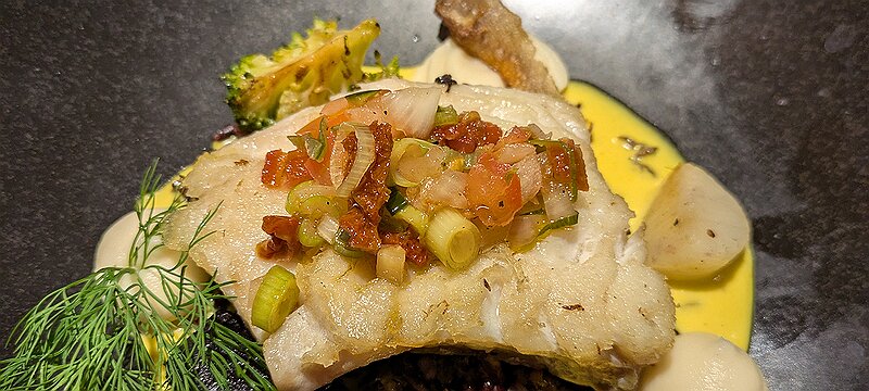 Dos de lieu noir, poêlée de riz vénéré aux butternut, sauce safran