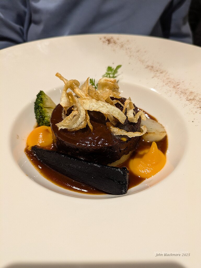 Parmentier de boudin, légumes, jus corse