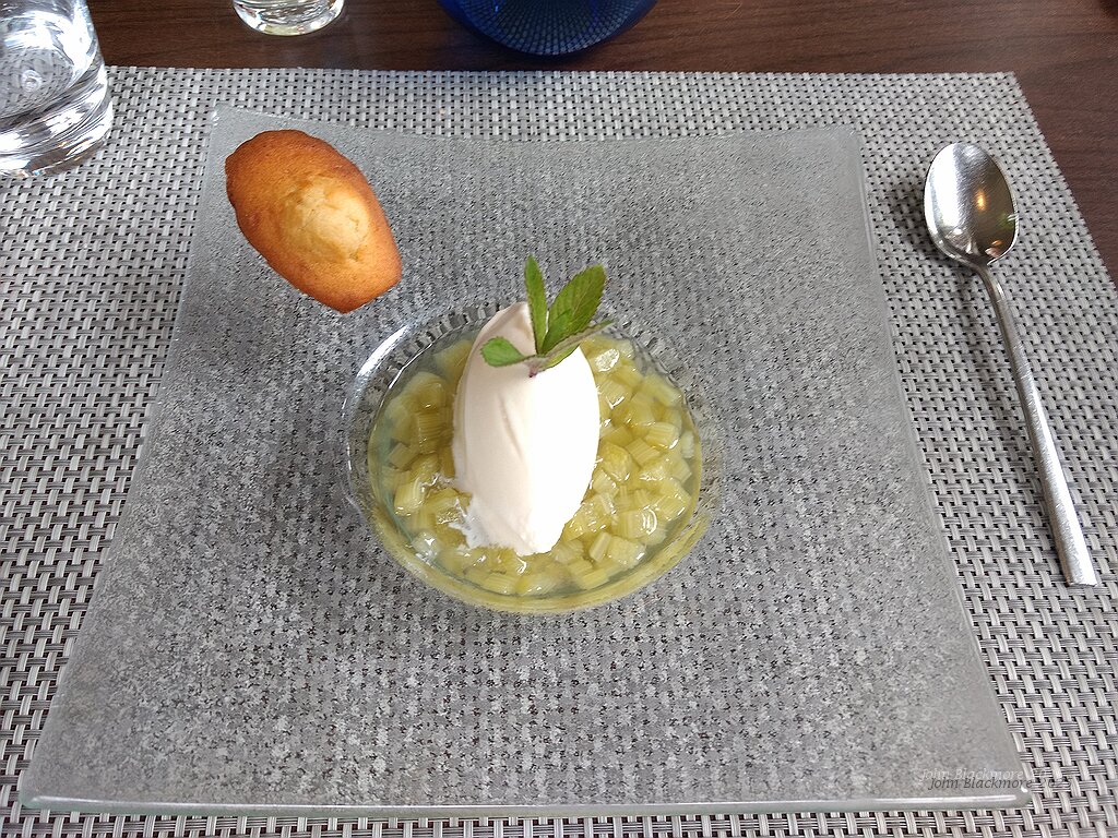 Dessert: Rhubarbe infusée au sureau, glace yaourt et madeleine tiède