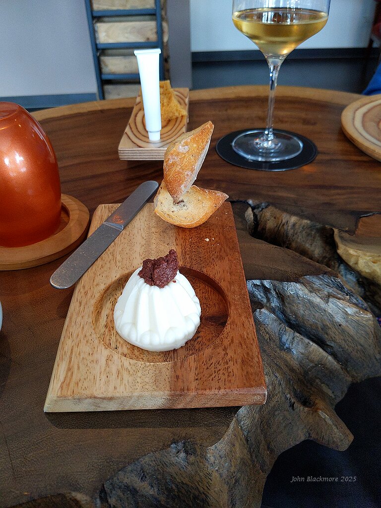 amuse bouche: white cheese with tapenade and olive bread