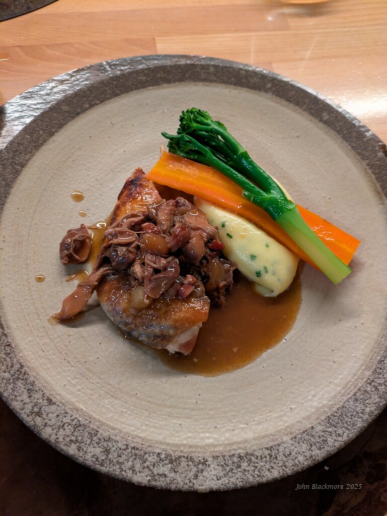 Roast Guinea Fowl Crown, Pomme Purée, Sauce ‘Coq au Vin’