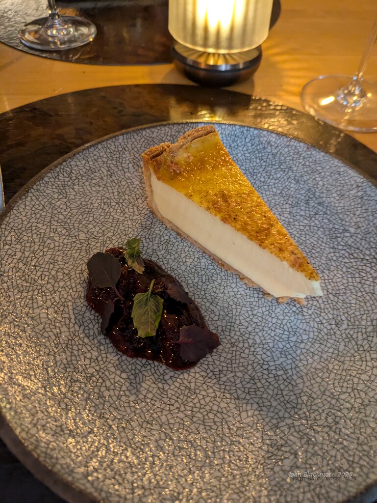 Cardamom spiced duck egg custard tart, mirabelle plum and rose