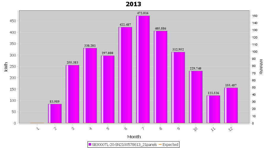 | Month | Yield (kWh) | Wp | kWh/kWp | Co2 (Kg) | Savings | % |