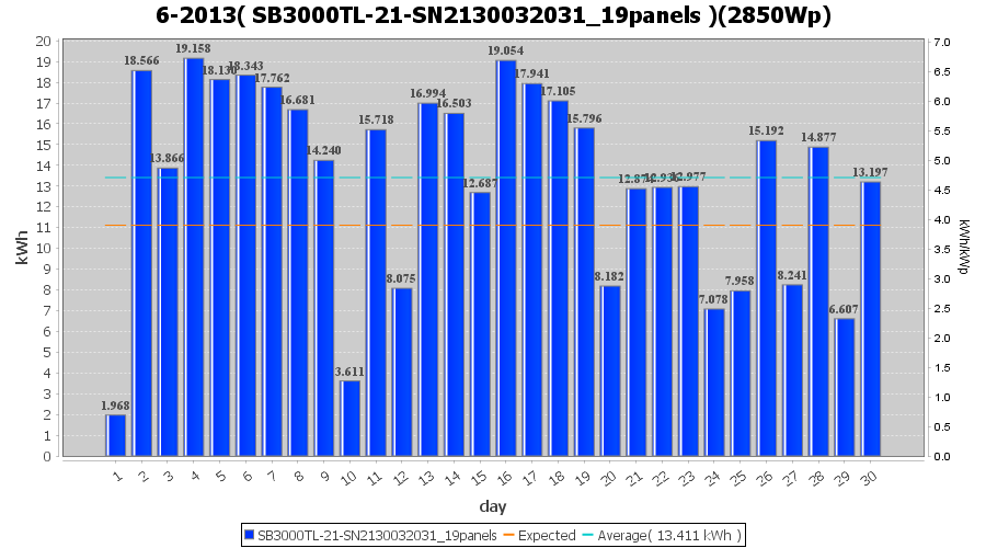 | 19-6-2013 | kWh | Sum | W/Wp | 32.377 | 6000 | 5.4 | 14.974 | € 11.46 | 3.9 |
