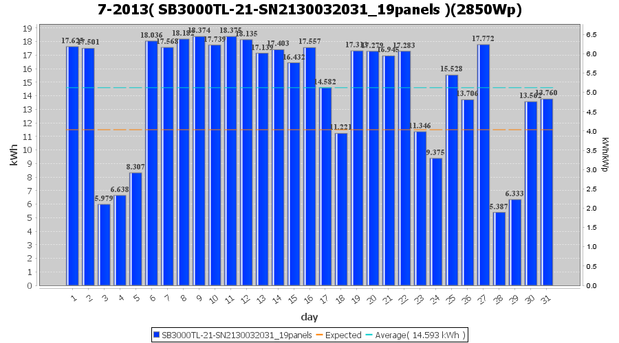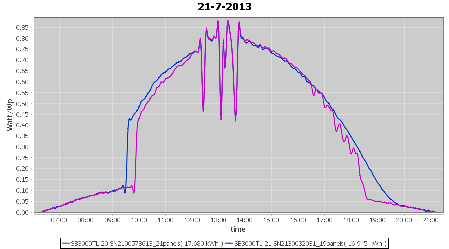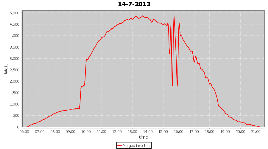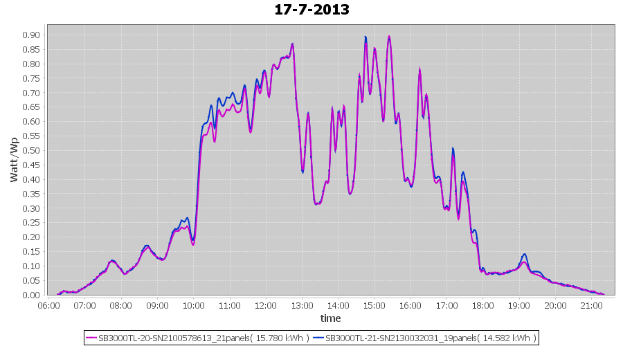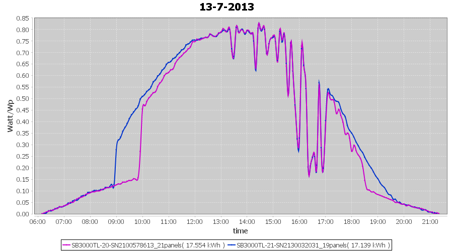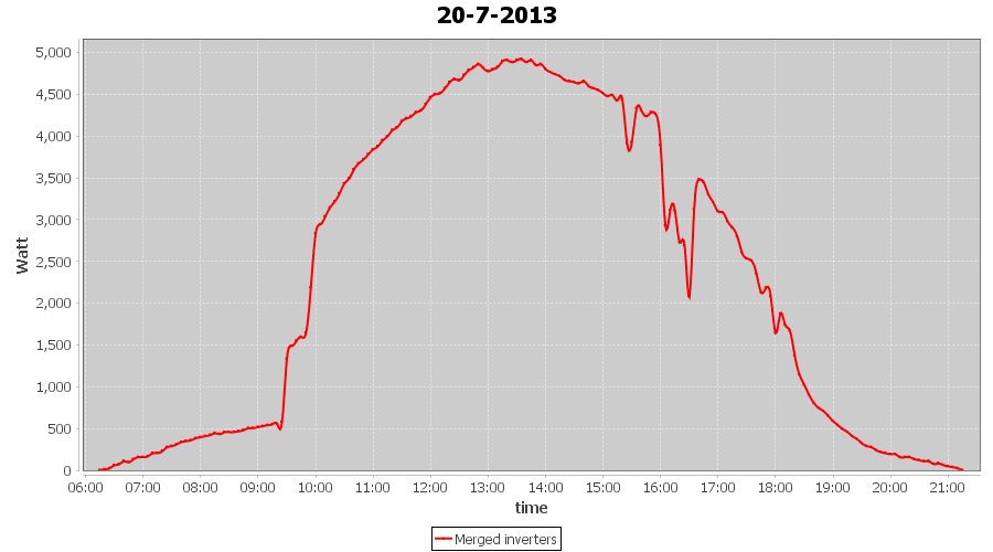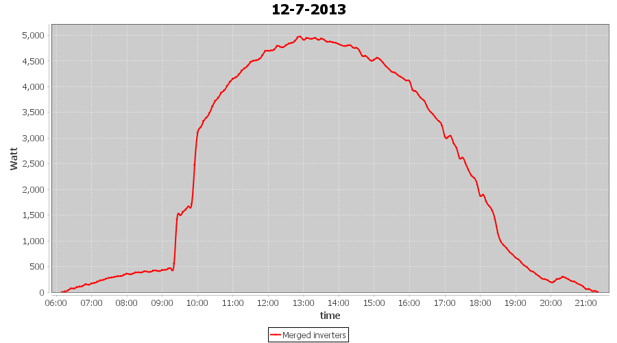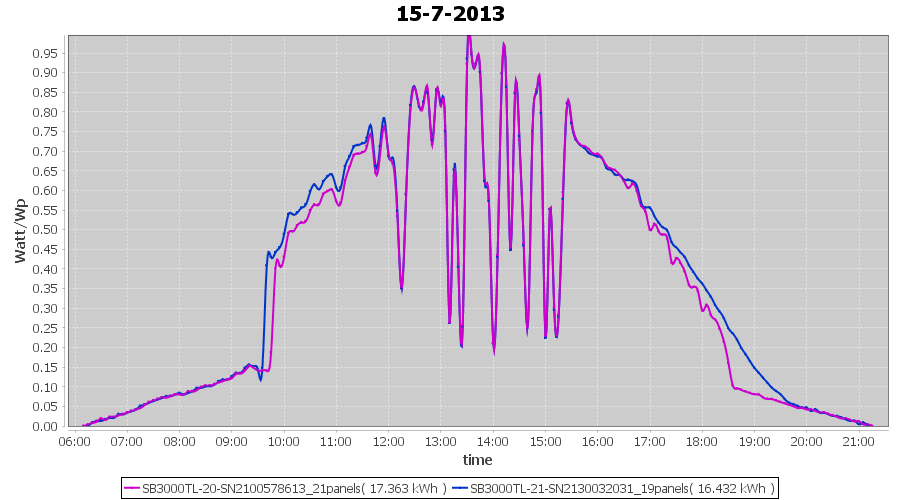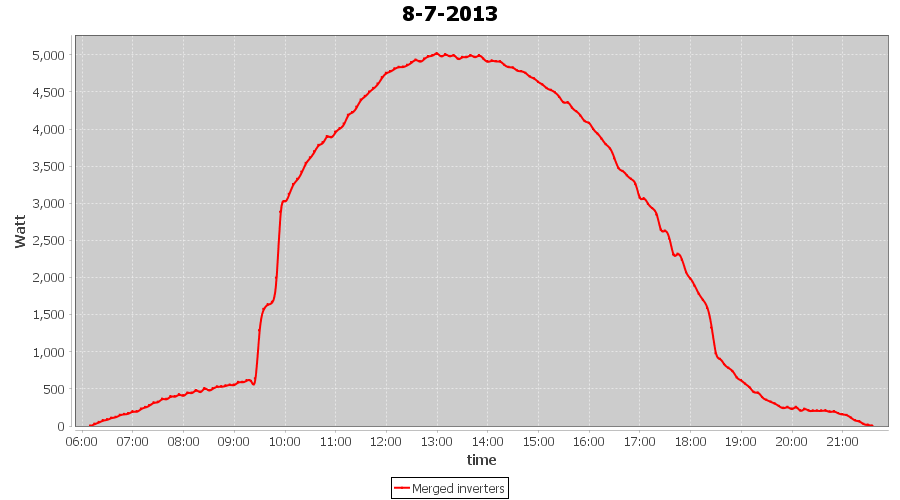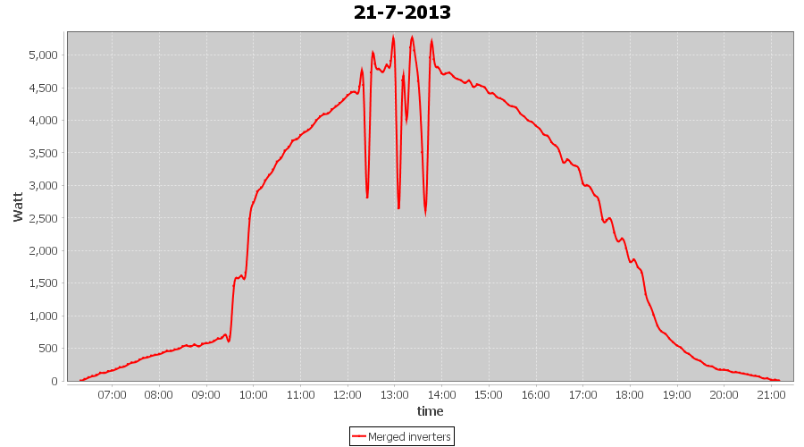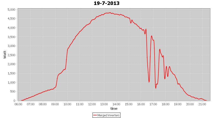 | 17-7-2013 | kWh | Sum | W/Wp | 30.362 | 6000 | 5.1 | 14.042 | € 10.74 | 3.3 |