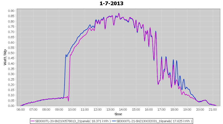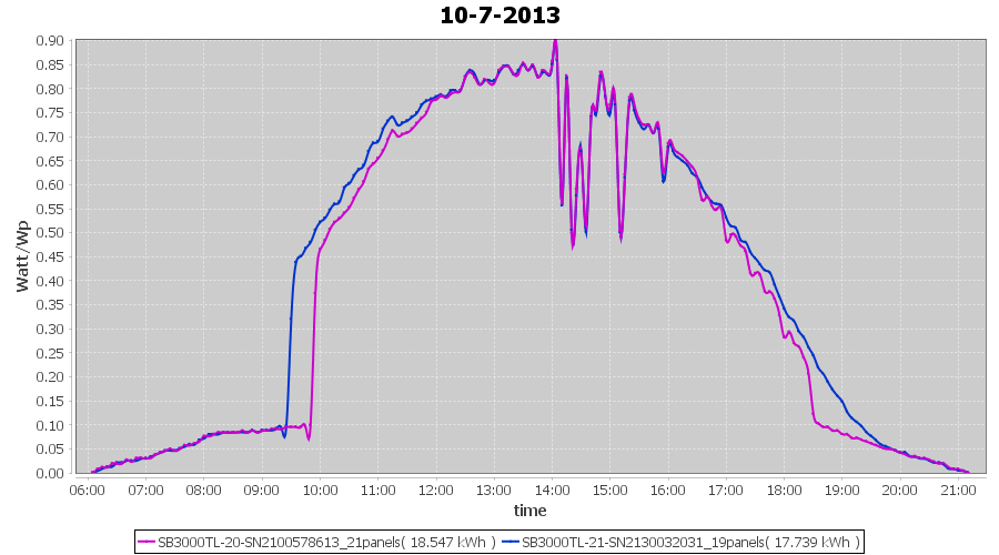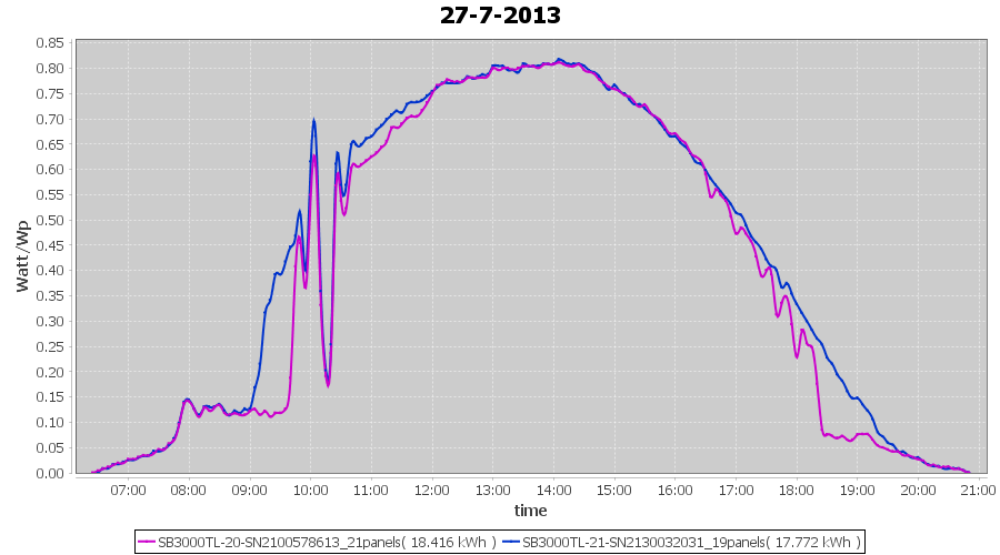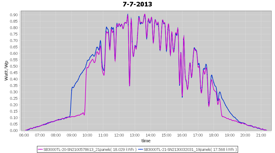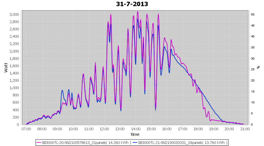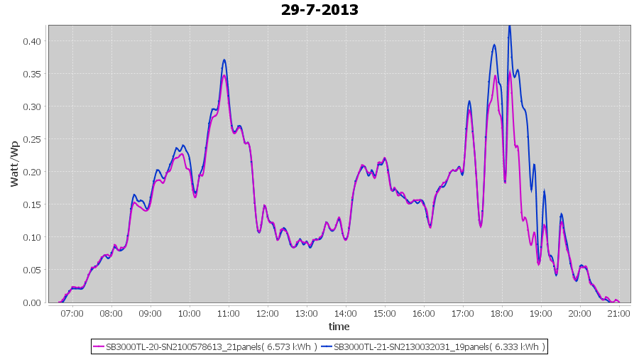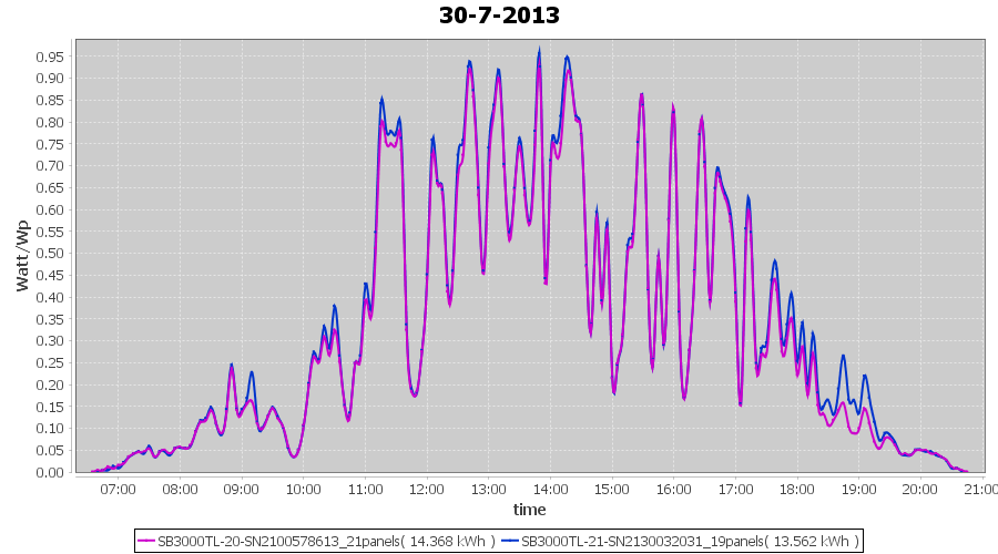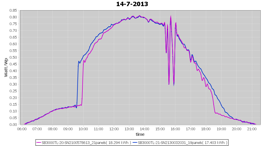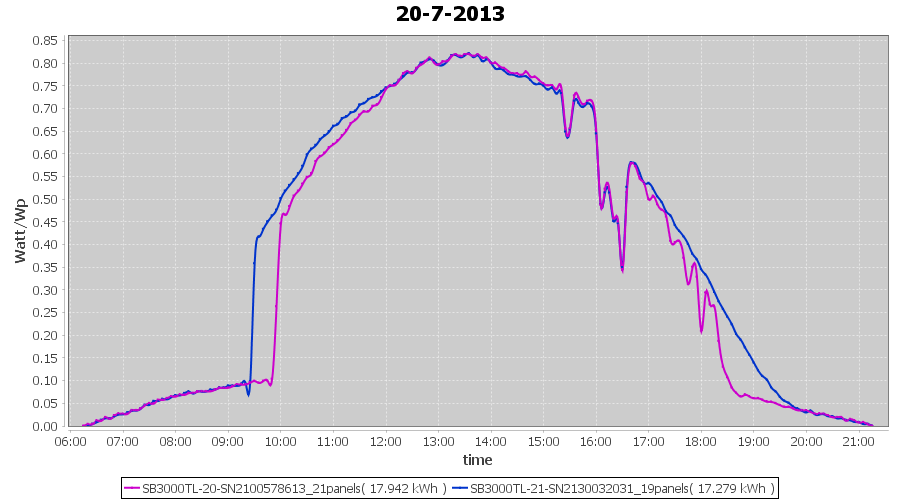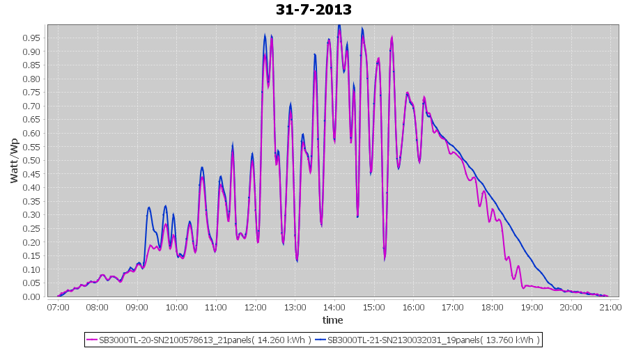 | 17-7-2013 | kWh | Sum | W/Wp | 30.362 | 6000 | 5.1 | 14.042 | € 10.74 | 3.3 |