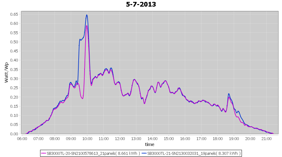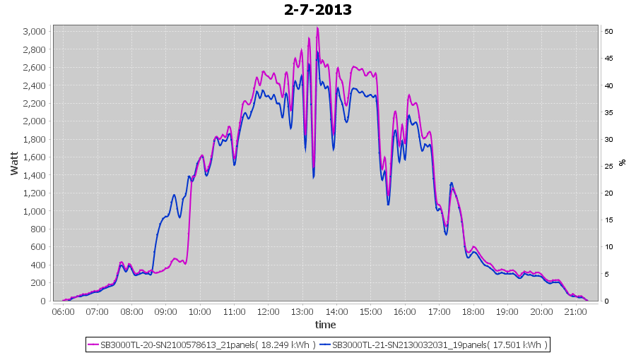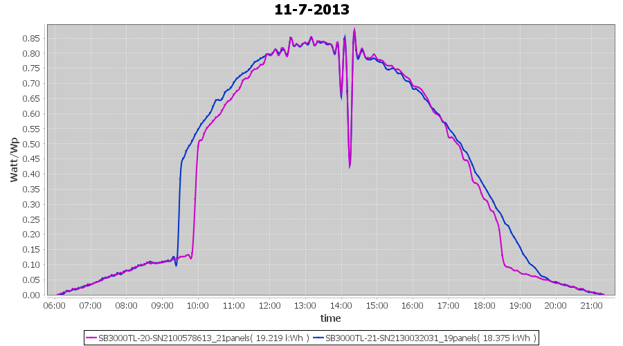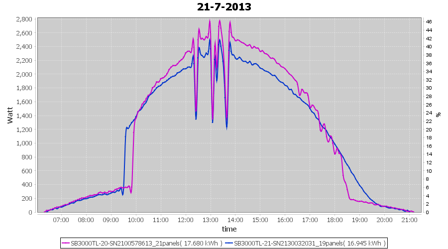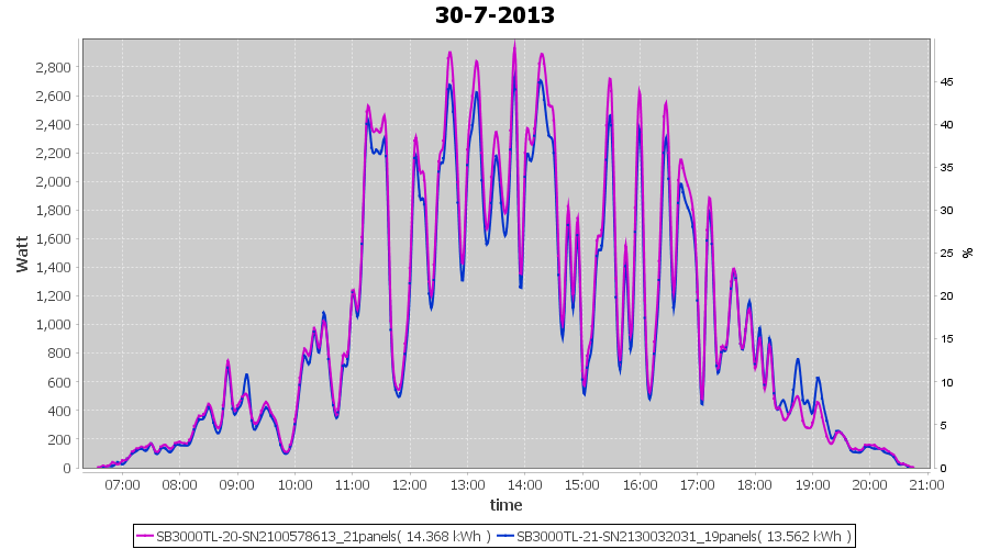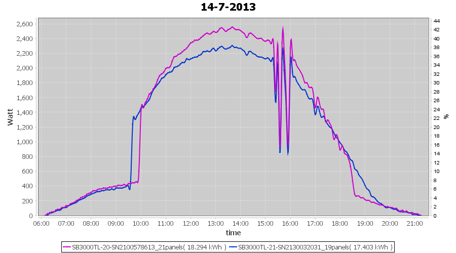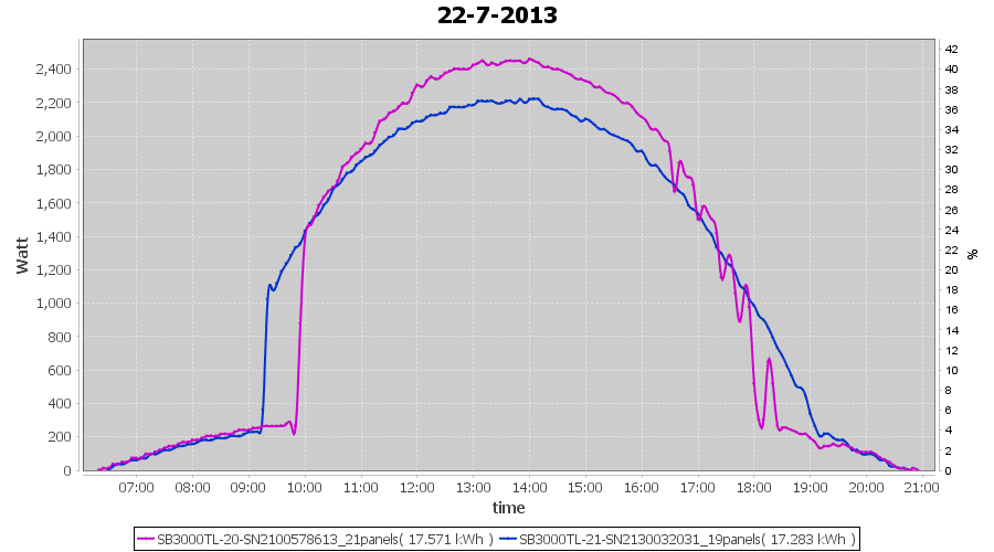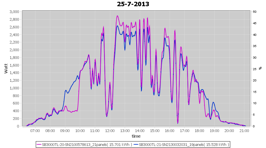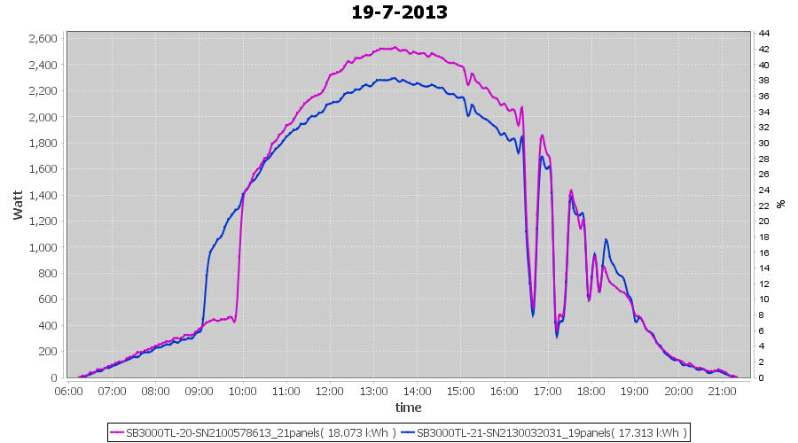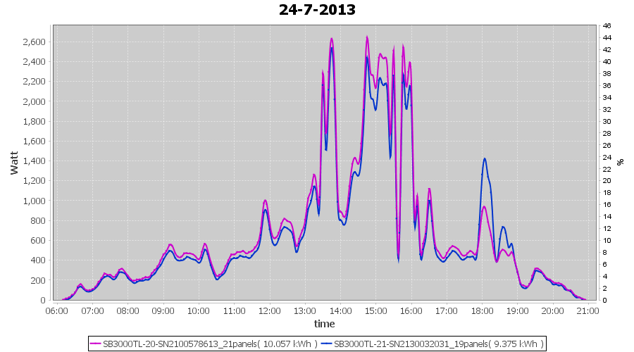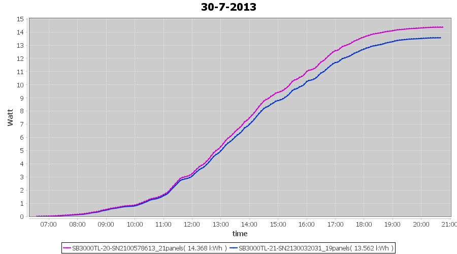 | 17-7-2013 | kWh | Sum | W/Wp | 30.362 | 6000 | 5.1 | 14.042 | € 10.74 | 3.3 |