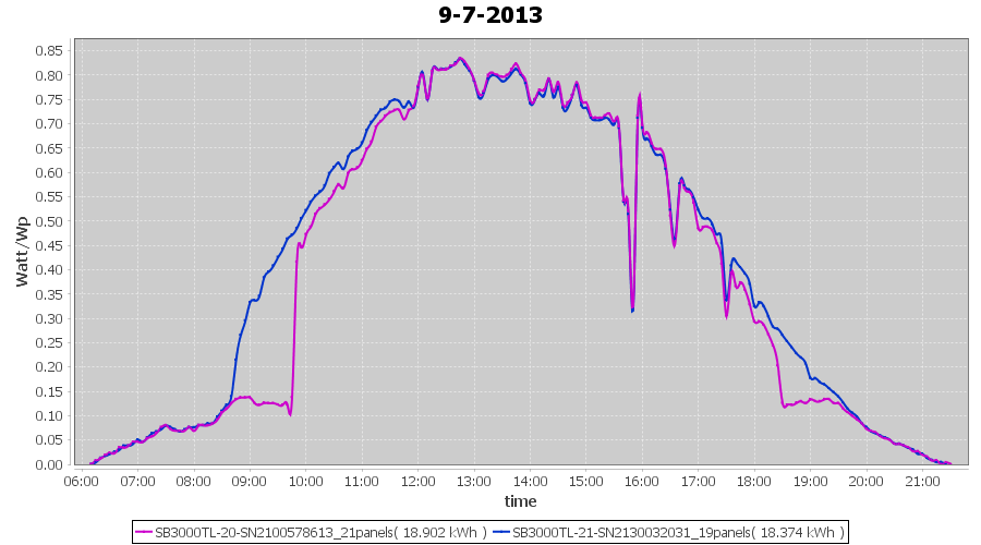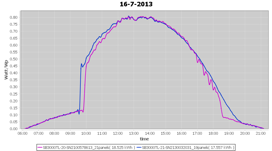 | 16-7-2013 | kWh | Sum | W/Wp | 36.082 | 6000 | 6.0 | 16.688 | € 12.77 | 3.9 |