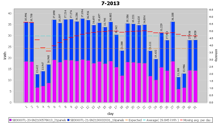 | 27-7-2013 | kWh | Sum | W/Wp | 36.188 | 6000 | 6.0 | 16.737 | € 12.80 | 3.9 |