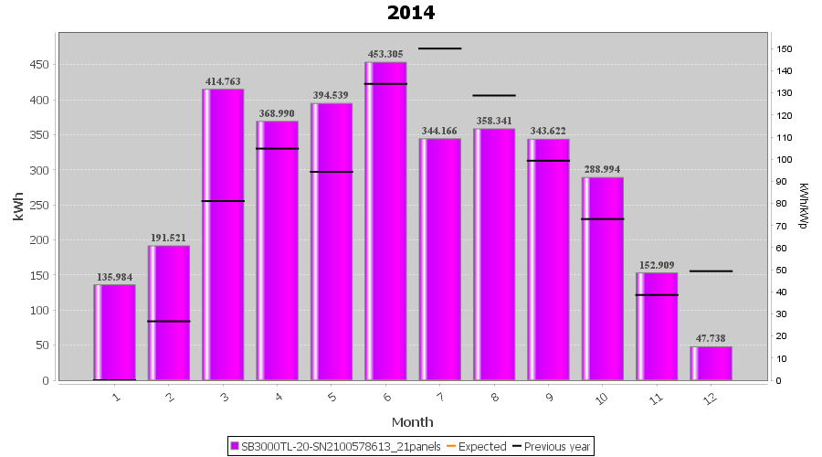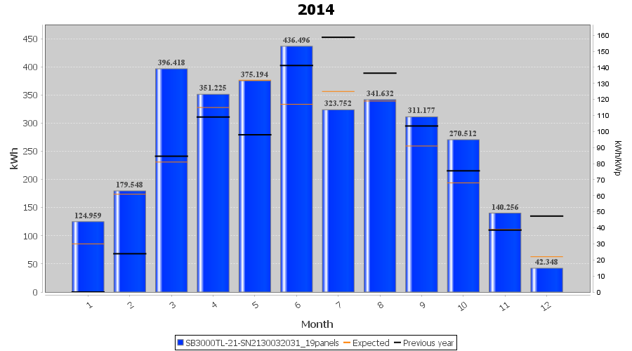 | Month | Yield (kWh) | Wp | kWh/kWp | Co2 (Kg) | Savings | % |
