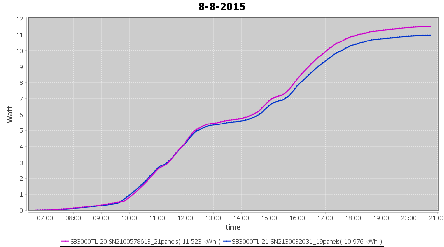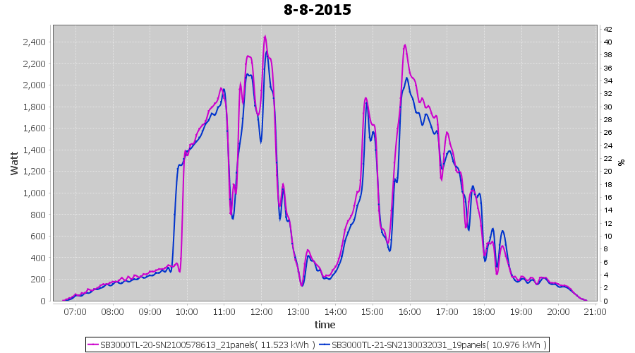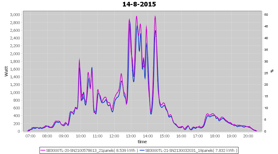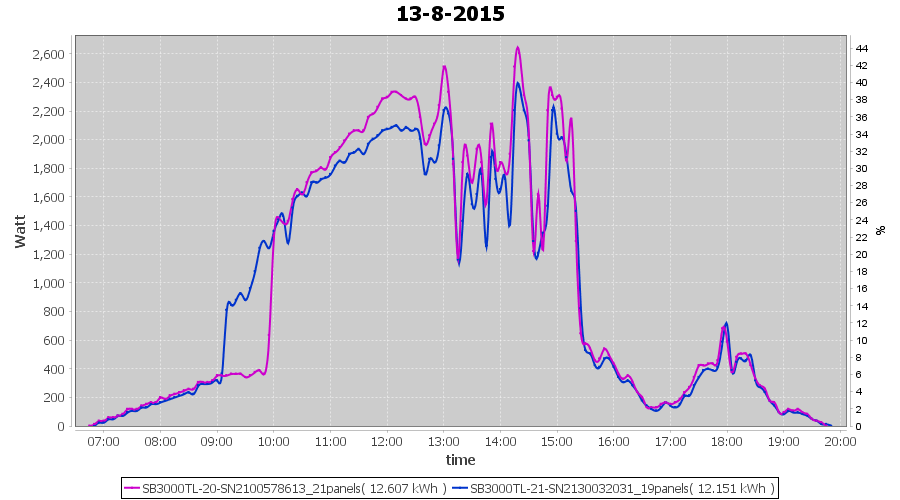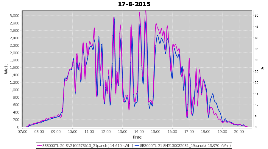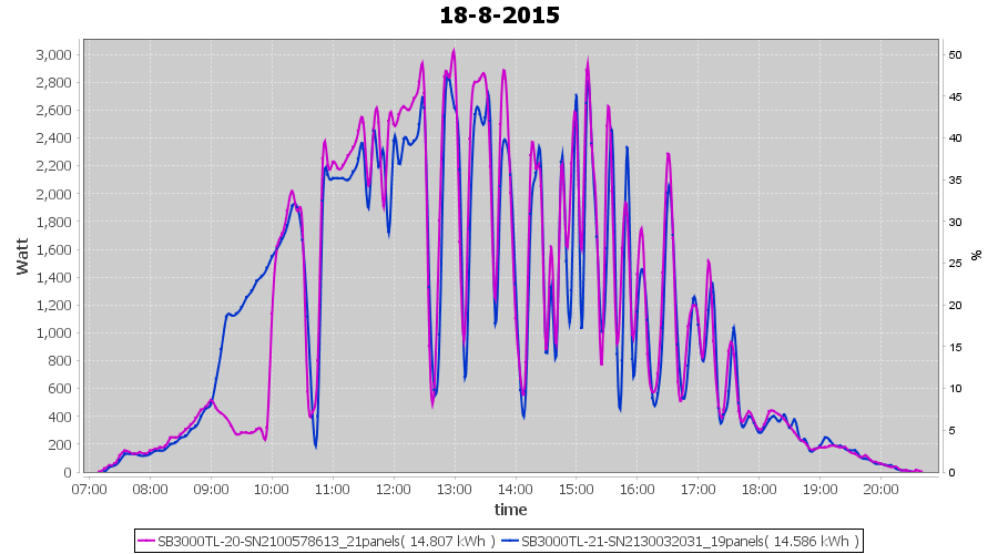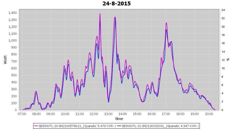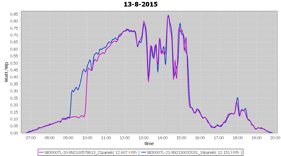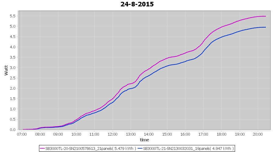 | 13-8-2015 | kWh | Sum | W/Wp | 24.758 | 6000 | 4.1 | 11.451 | € 8.80 | 3.1 |