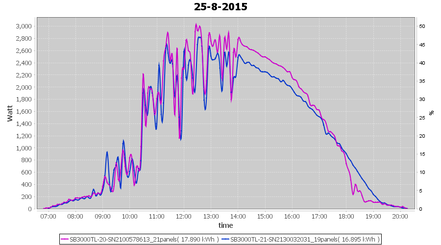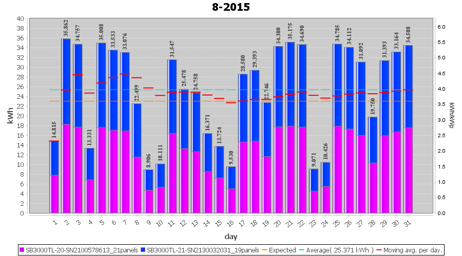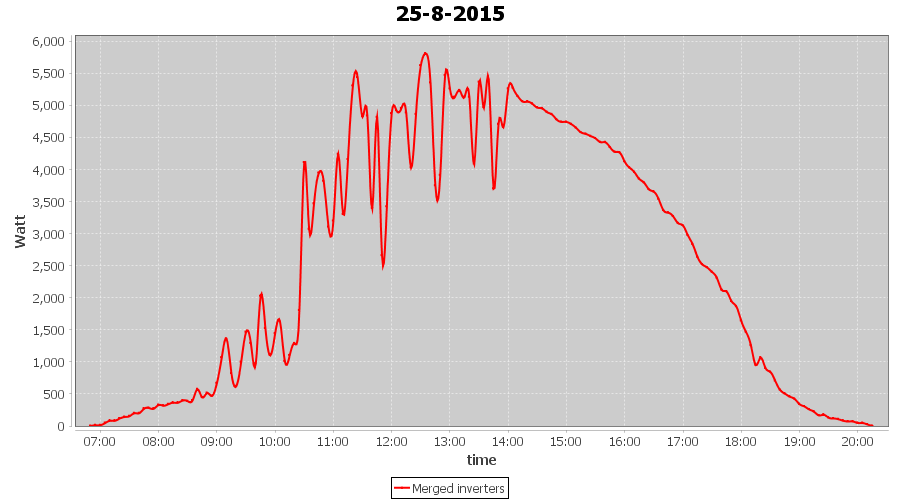 | 25-8-2015 | kWh | Sum | W/Wp | 34.785 | 6000 | 5.8 | 16.088 | € 12.36 | 4.4 |