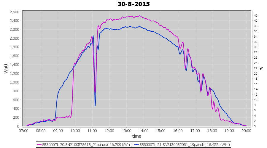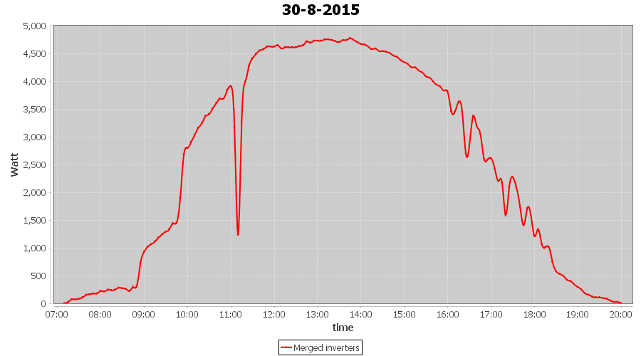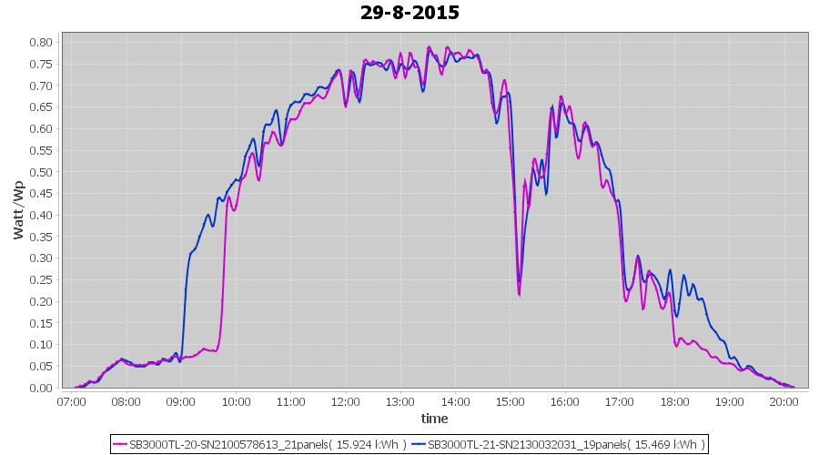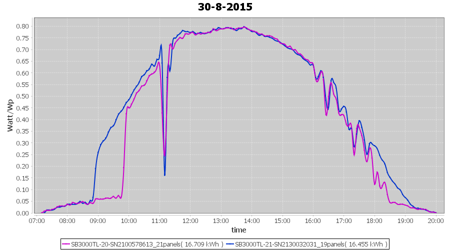 | 30-8-2015 | kWh | Sum | W/Wp | 33.164 | 6000 | 5.5 | 15.338 | € 11.79 | 4.2 |