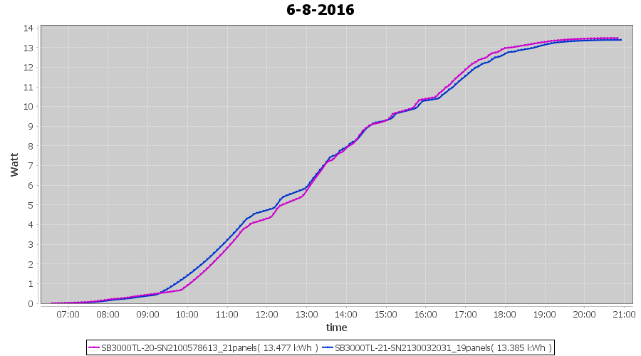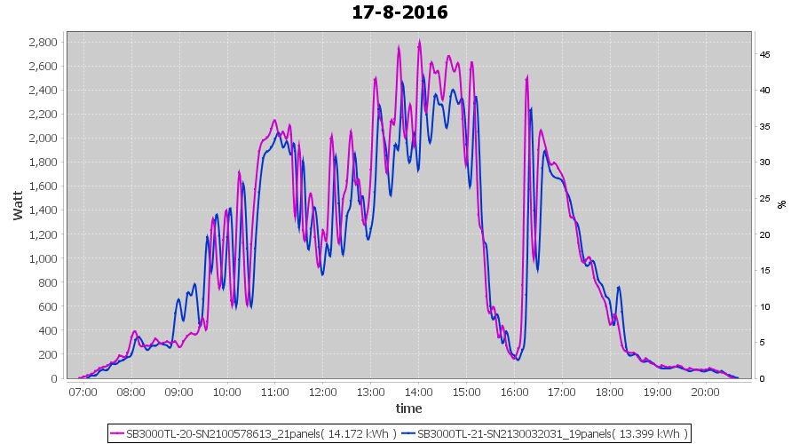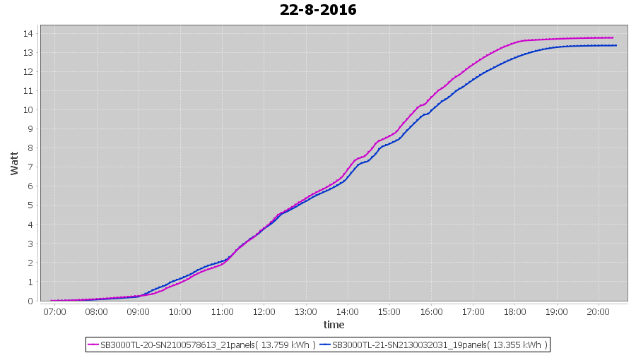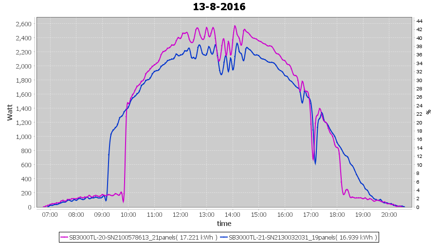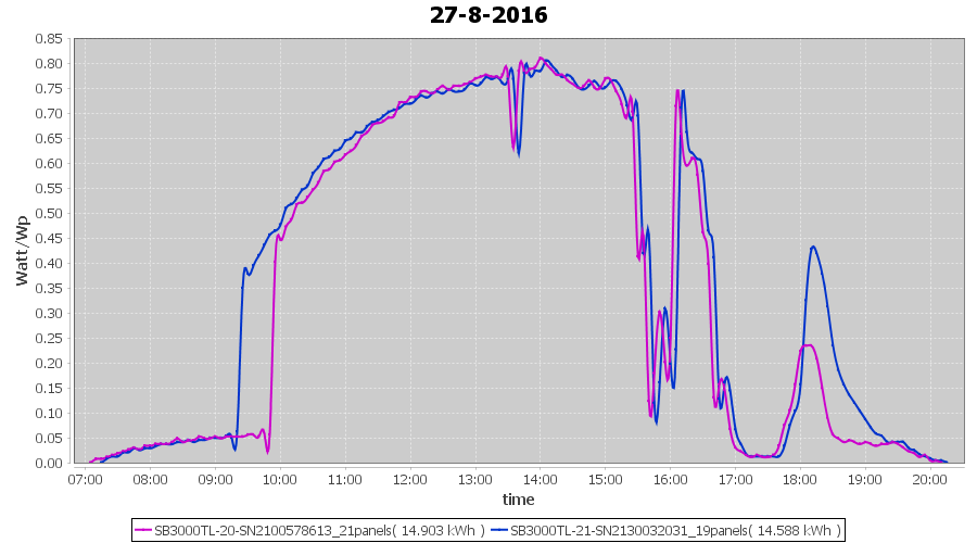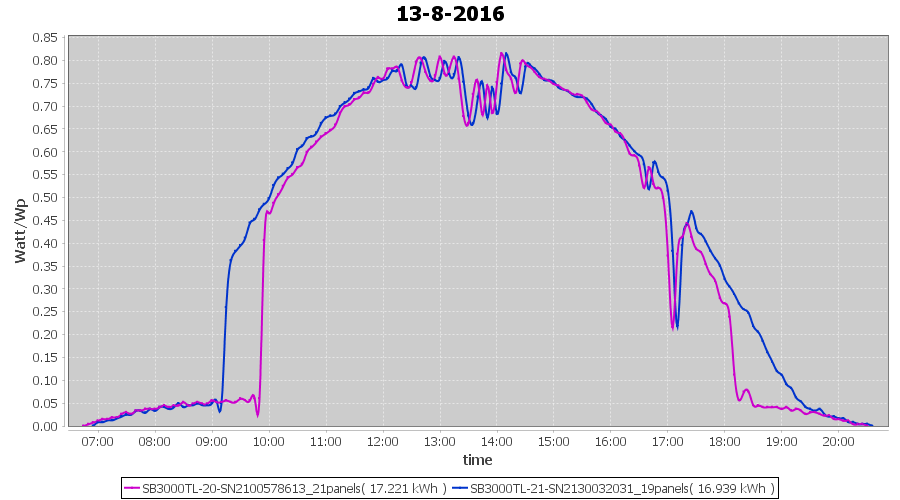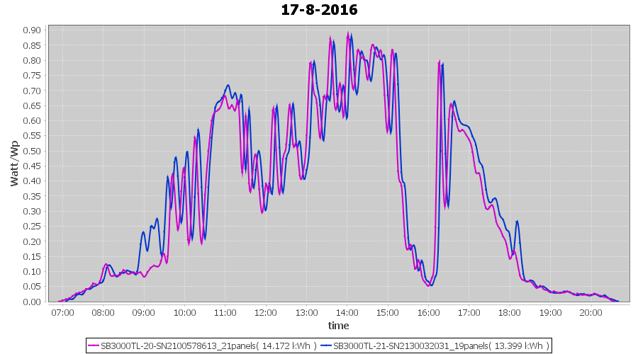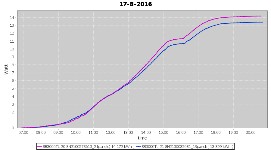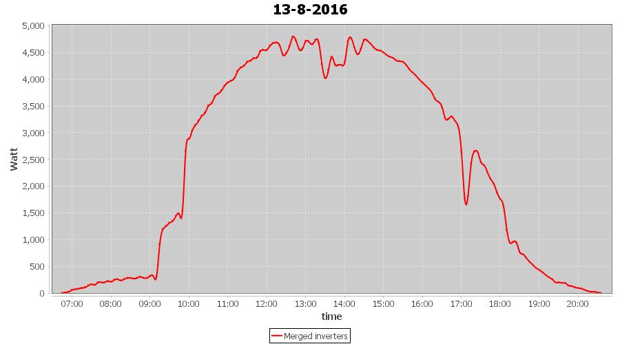 | 13-8-2016 | kWh | Sum | W/Wp | 34.160 | 6000 | 5.7 | 15.799 | € 12.15 | 4.1 |