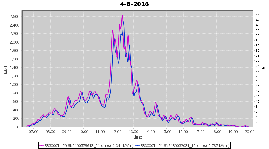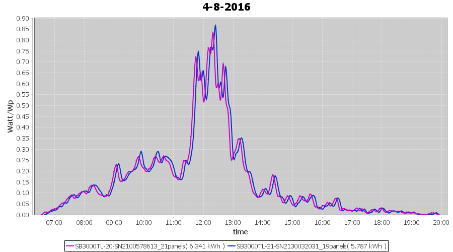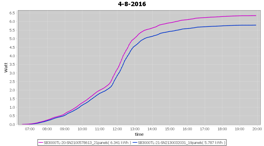 | 4-8-2016 | kWh | Sum | W/Wp | 12.128 | 6000 | 2.0 | 5.609 | € 4.31 | 1.4 |