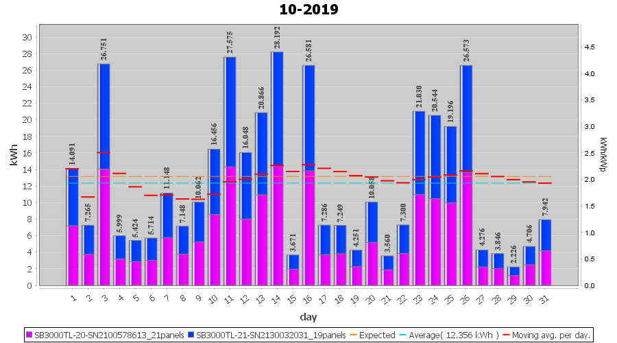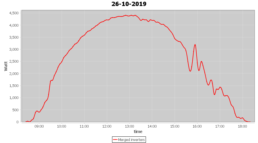 | 26-10-2019 | kWh | Sum | W/Wp | 26.573 | 6000 | 4.4 | 12.290 | € 9.53 | 6.9 |