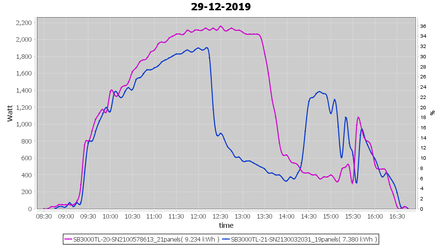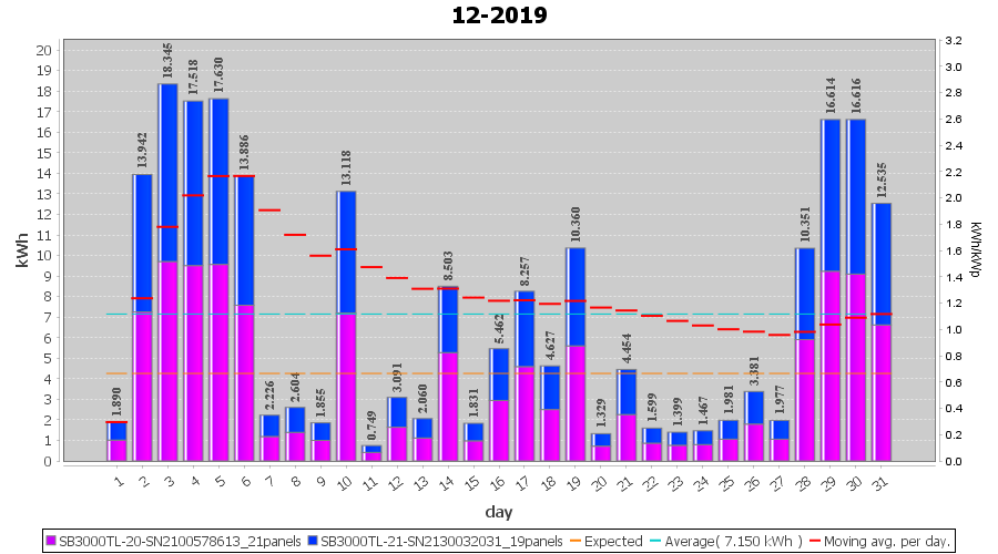 | 29-12-2019 | kWh | Sum | W/Wp | 16.614 | 6000 | 2.8 | 7.684 | € 5.96 | 7.5 |