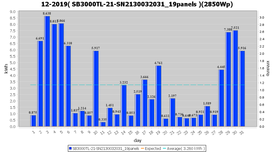 | 17-12-2019 | kWh | Sum | W/Wp | 8.257 | 6000 | 1.4 | 3.819 | € 2.96 | 3.7 |