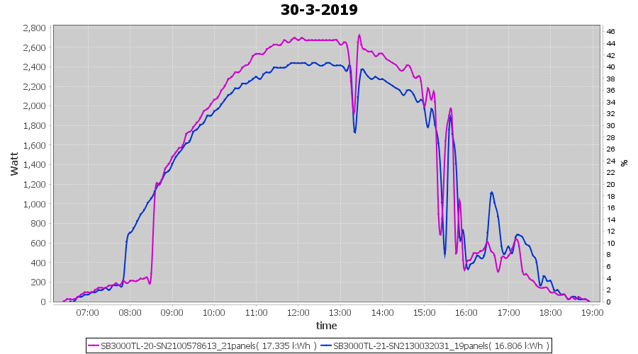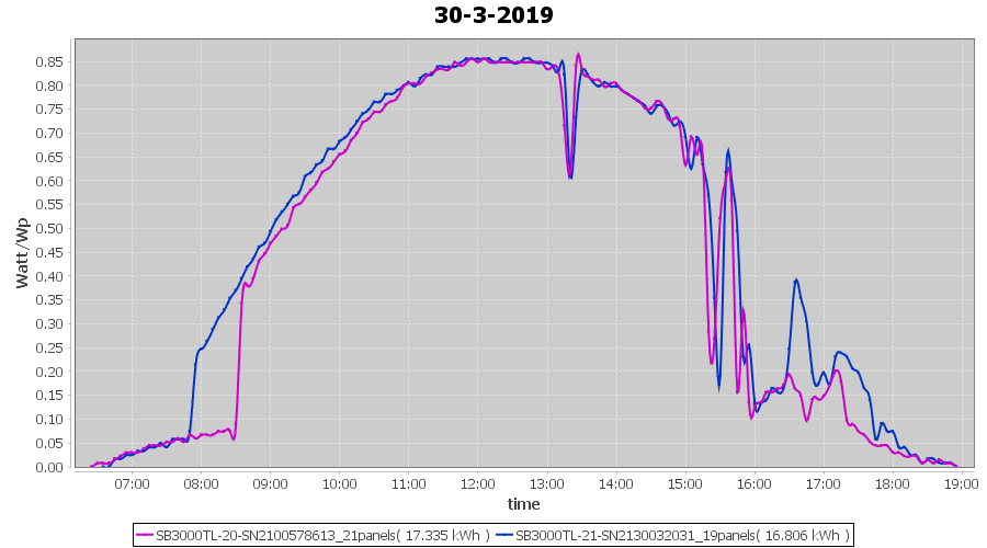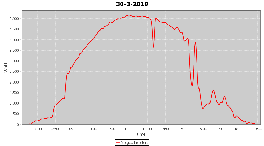 | 30-3-2019 | kWh | Sum | W/Wp | 34.141 | 6000 | 5.7 | 15.790 | € 12.25 | 5.4 |