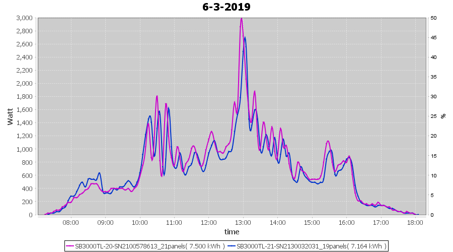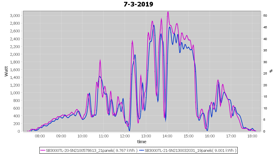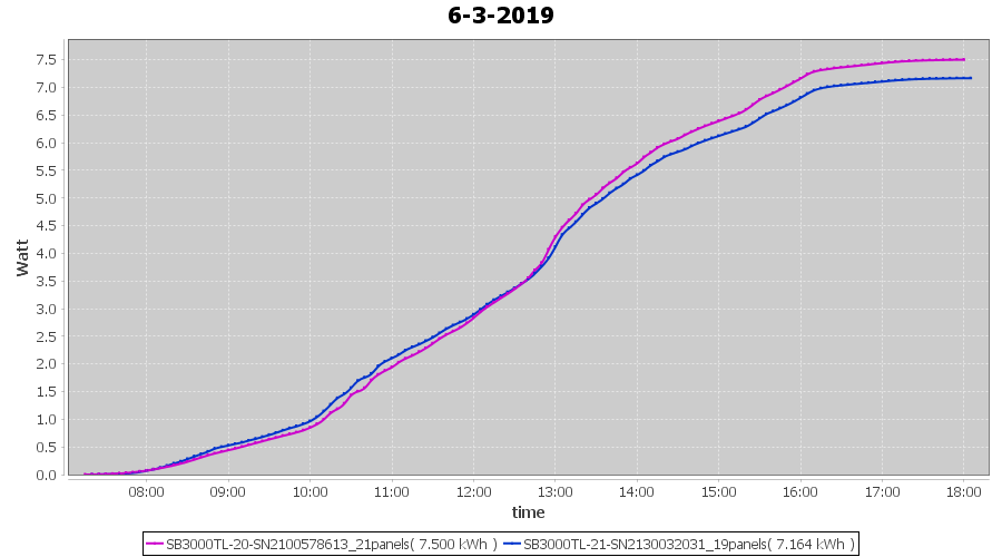 | 7-3-2019 | kWh | Sum | W/Wp | 18.768 | 6000 | 3.1 | 8.680 | € 6.73 | 3.0 |