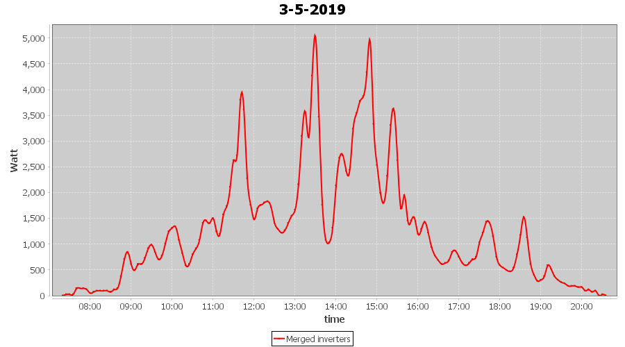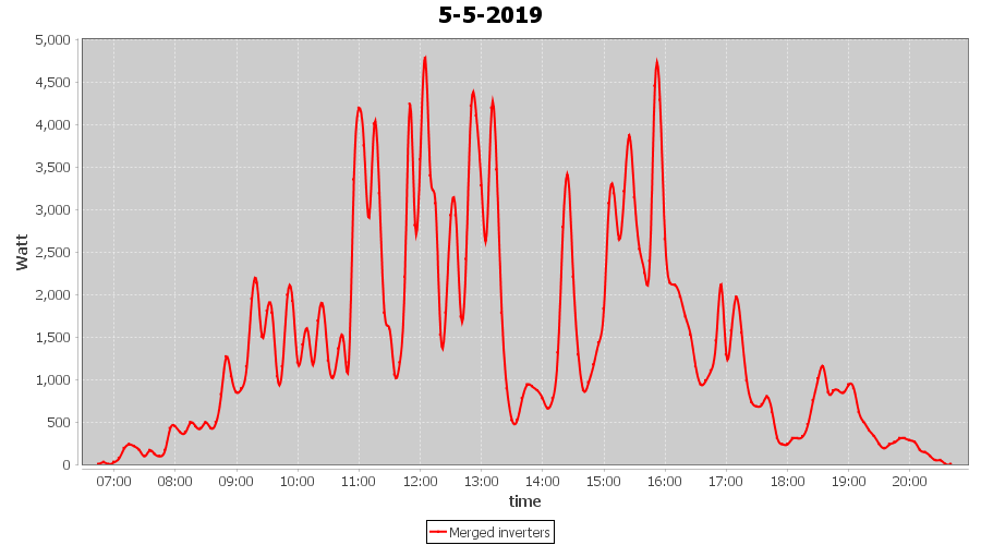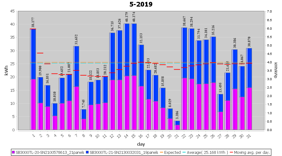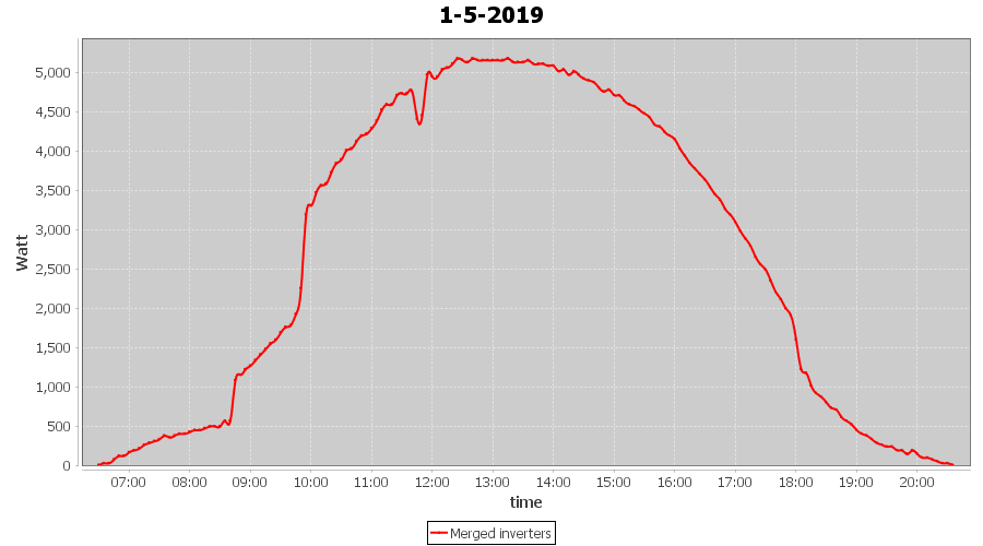 | 1-5-2019 | kWh | Sum | W/Wp | 38.177 | 6000 | 6.4 | 17.657 | € 13.70 | 4.9 |