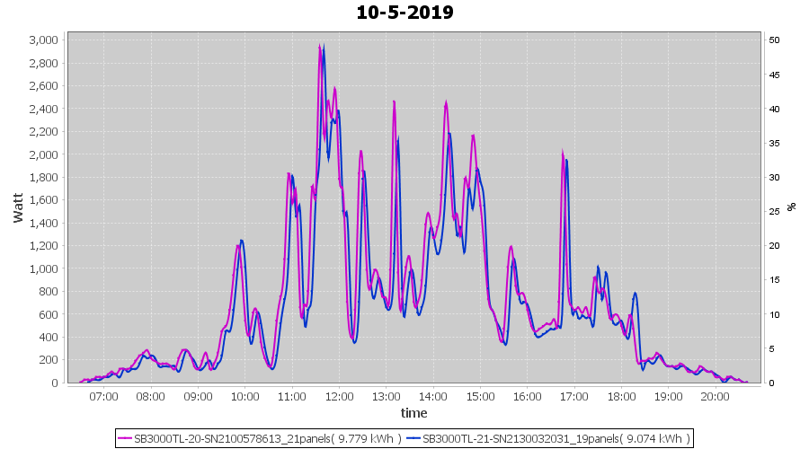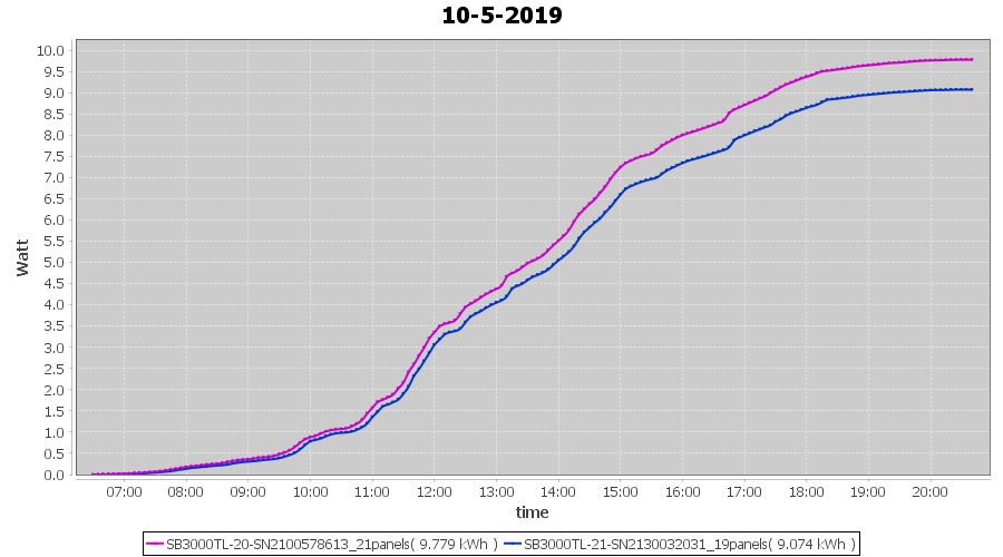 | 10-5-2019 | kWh | Sum | W/Wp | 18.853 | 6000 | 3.1 | 8.720 | € 6.76 | 2.4 |