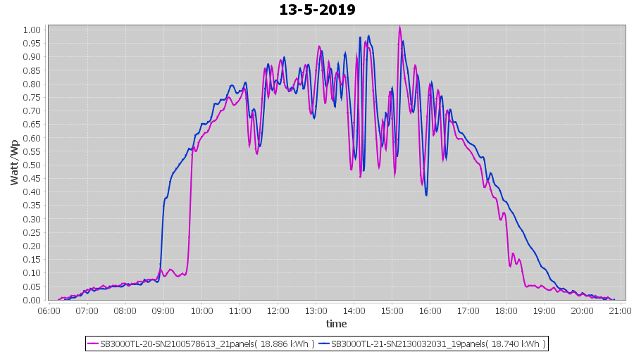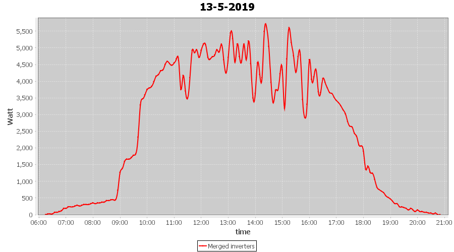 | 13-5-2019 | kWh | Sum | W/Wp | 37.626 | 6000 | 6.3 | 17.402 | € 13.50 | 4.8 |