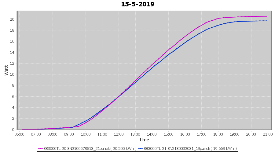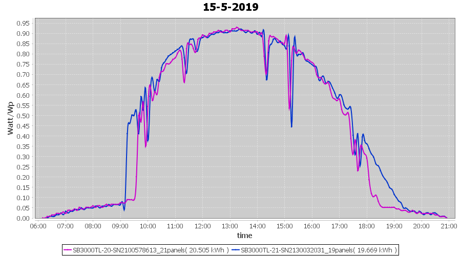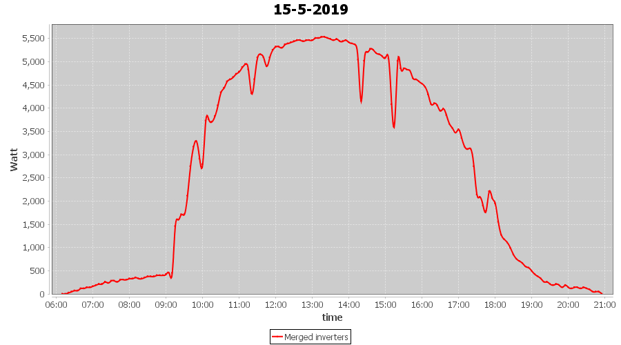 | 15-5-2019 | kWh | Sum | W/Wp | 40.174 | 6000 | 6.7 | 18.580 | € 14.42 | 5.1 |