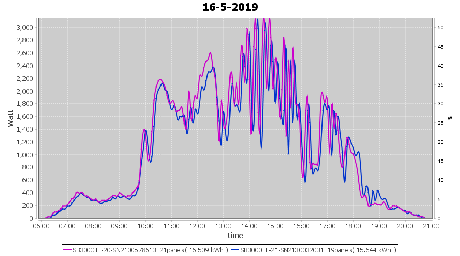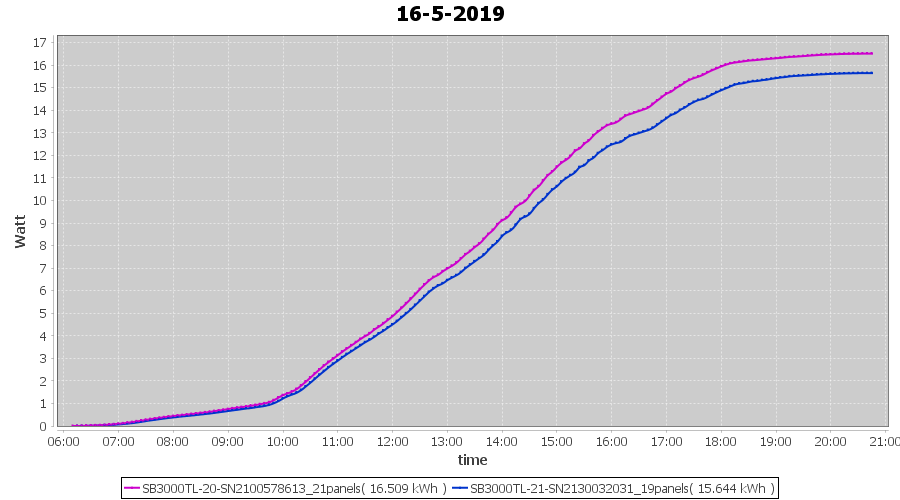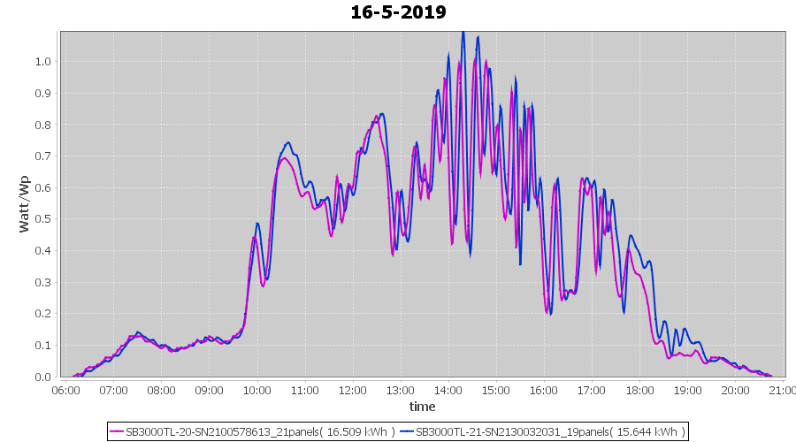| 16-5-2019 | kWh | Sum | W/Wp | 32.153 | 6000 | 5.4 | 14.871 | € 11.54 | 4.1 |