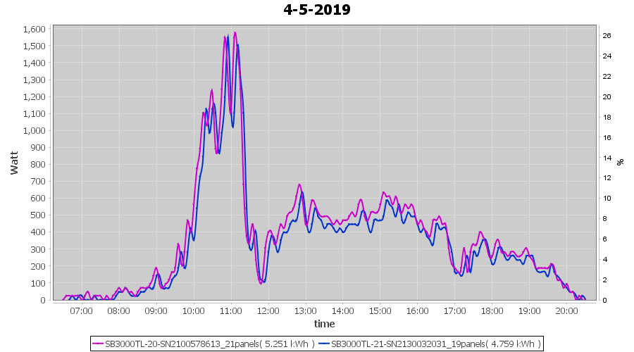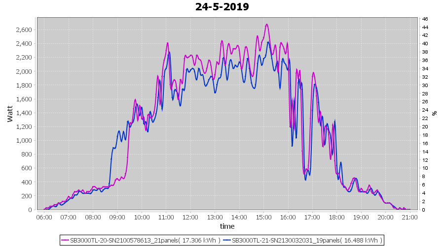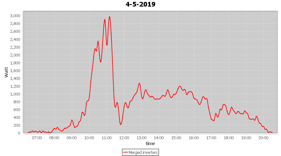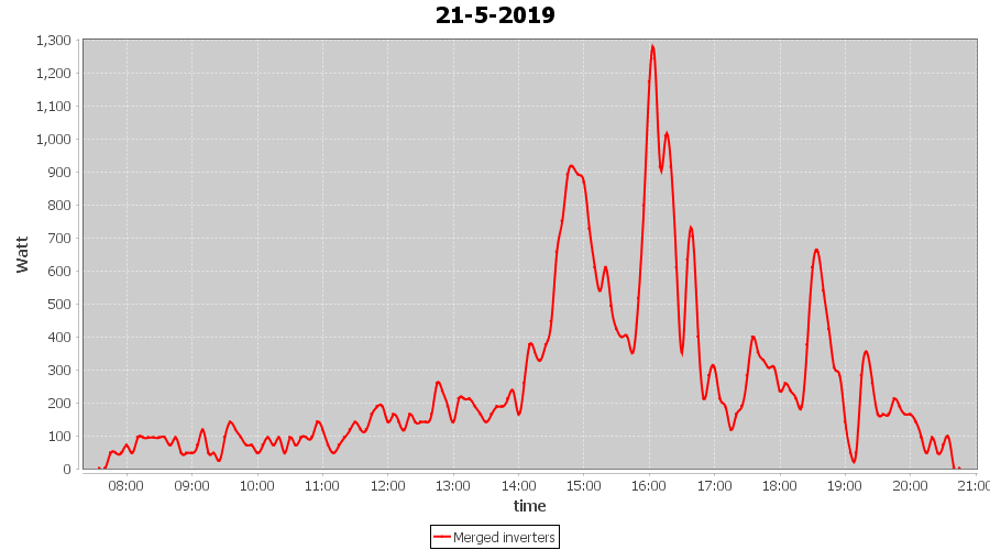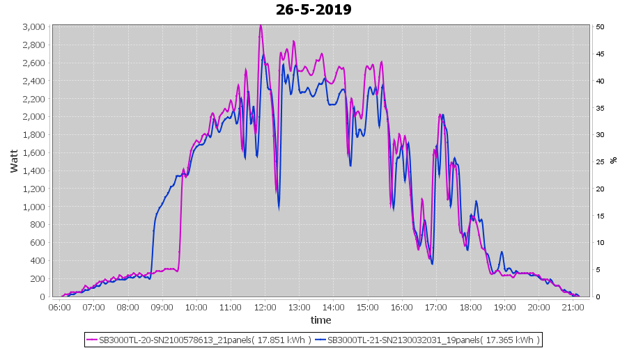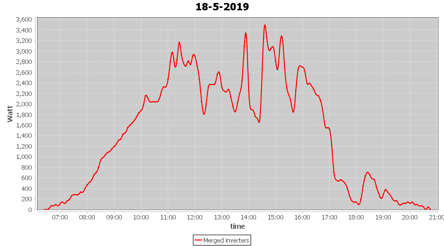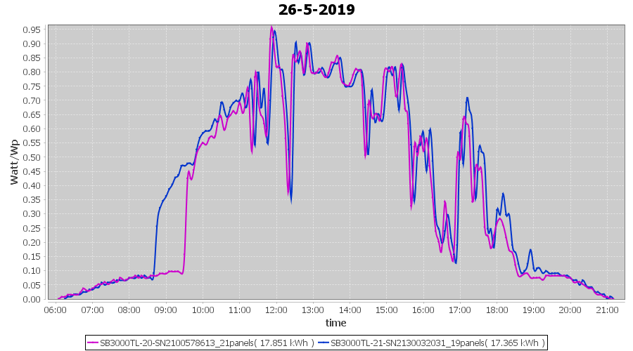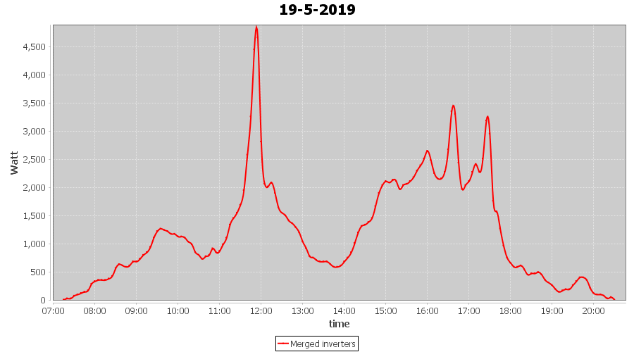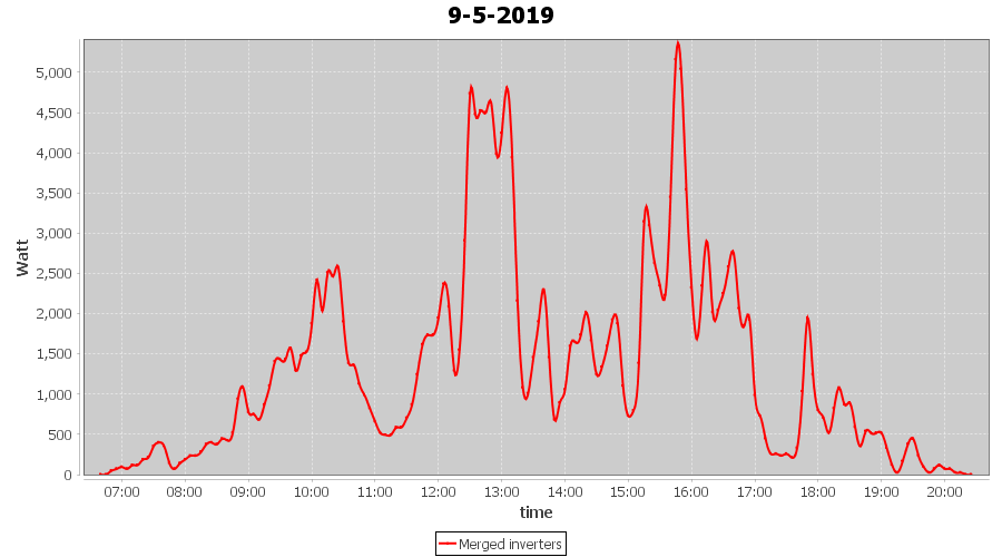 | 26-5-2019 | kWh | Sum | W/Wp | 35.216 | 6000 | 5.9 | 16.287 | € 12.64 | 4.5 |