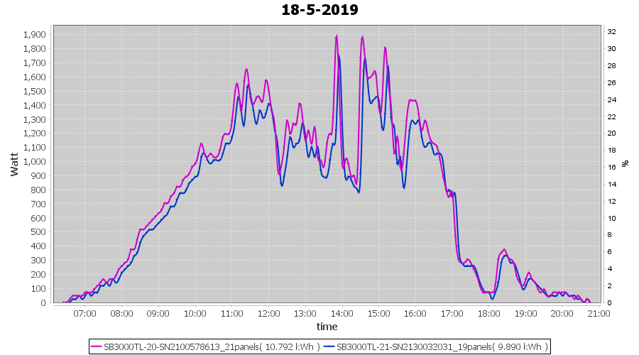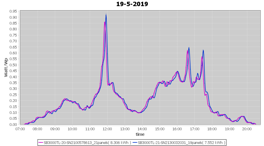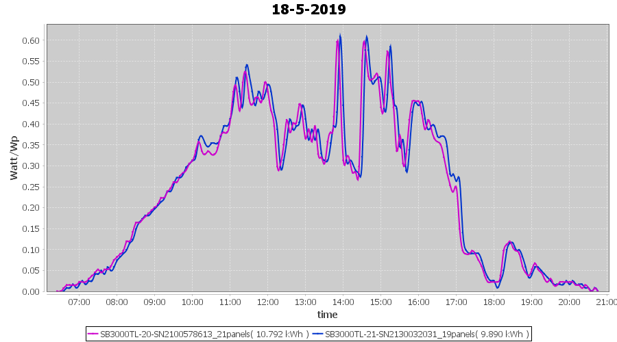| 18-5-2019 | kWh | Sum | W/Wp | 20.682 | 6000 | 3.4 | 9.565 | € 7.42 | 2.7 |