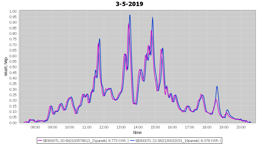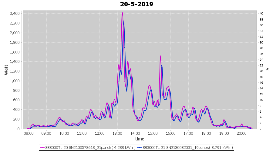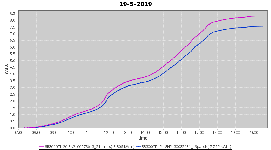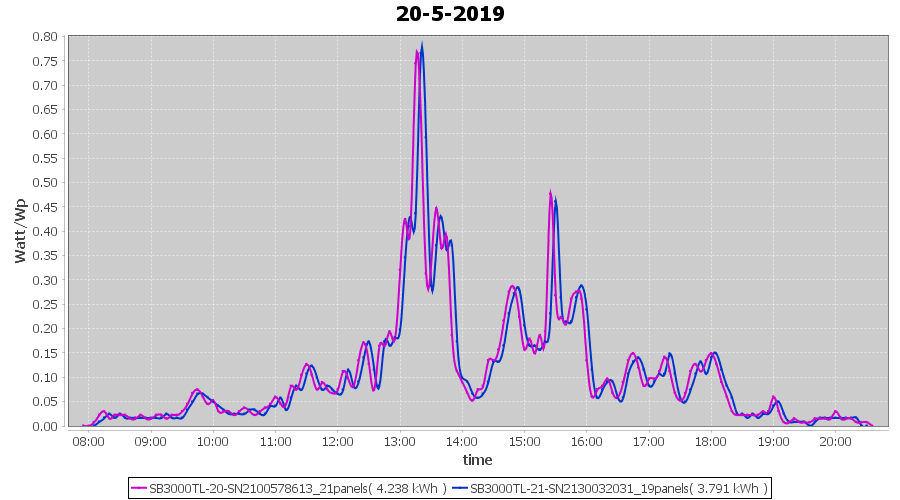 | 20-5-2019 | kWh | Sum | W/Wp | 8.029 | 6000 | 1.3 | 3.713 | € 2.88 | 1.0 |