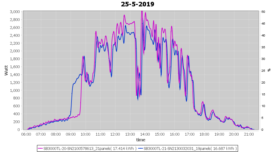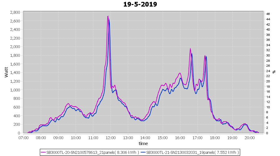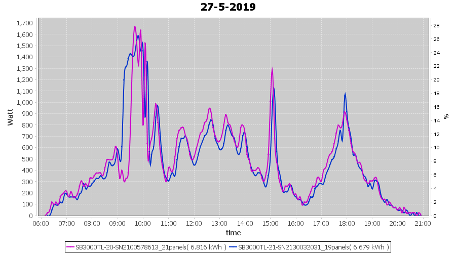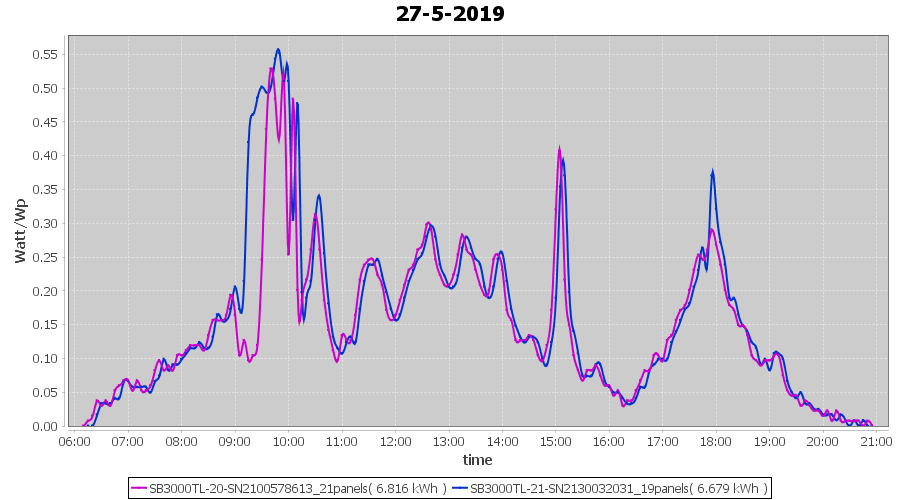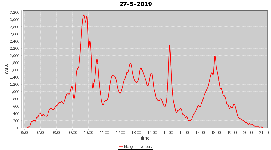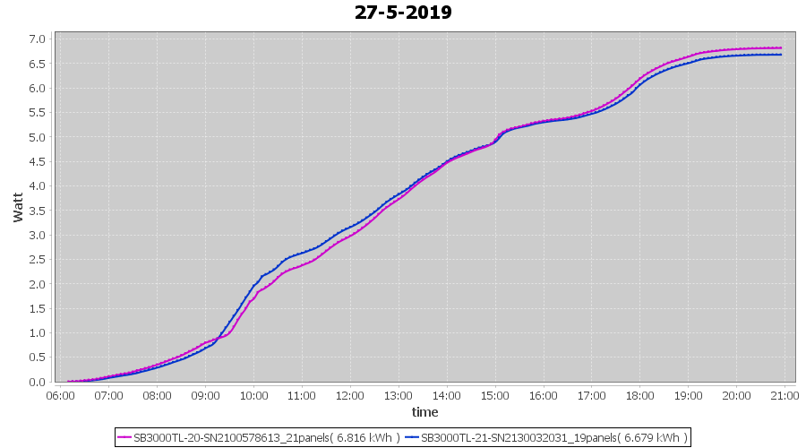 | 27-5-2019 | kWh | Sum | W/Wp | 13.495 | 6000 | 2.2 | 6.241 | € 4.84 | 1.7 |